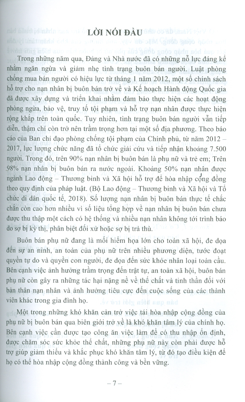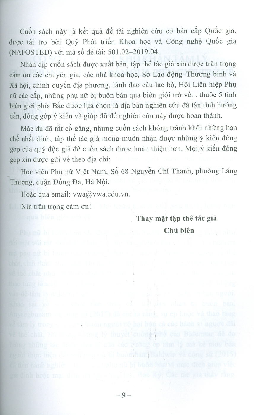 - Chương 6: Ảnh hưởng của khó khăn tâm lý đến kết quả tái hòa nhập cộng đồng của phụ nữ bị buôn bán qua biên giới trở về Cuốn sách này là kết quả đề tài nghiên cứu cơ bản cấp Quốc gia, được tài trợ bởi Quỹ Phát triển Khoa học và Công nghệ Quốc gia.