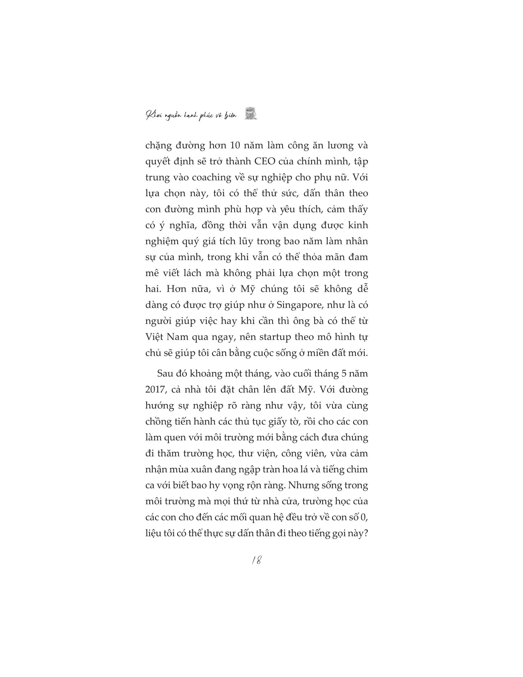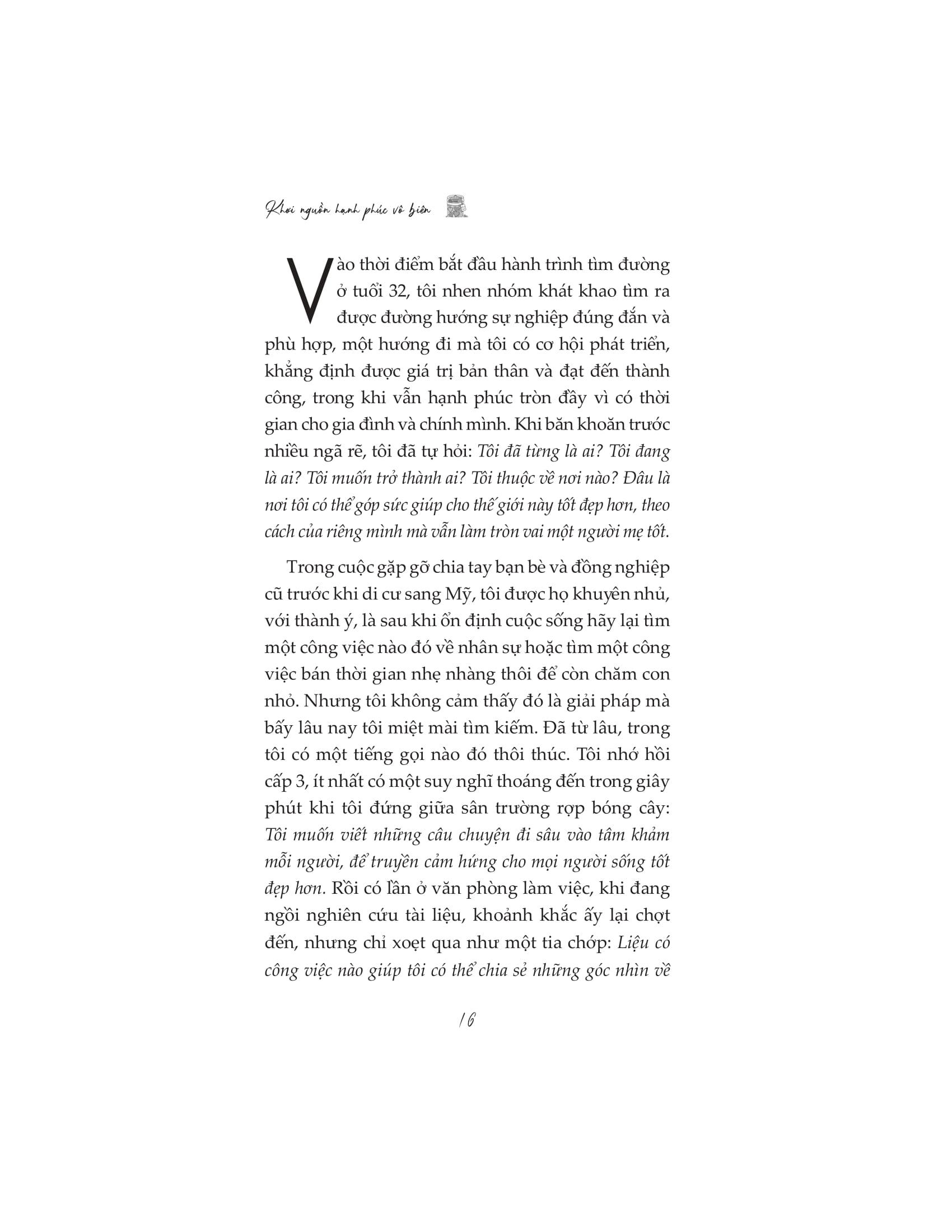 Ít lâu sau, cô đã bỏ việc để bắt đầu hành trình đi tìm ra câu trả lời. Và trong hành trình ấy sẽ được Amy ghi lại trong cuốn sách "KHƠI NGUỒN HẠNH PHÚC VÔ BIÊN" - cuốn sách mà chính bản thân tác giả đã "mang bầu" và "thai nghén" suốt 5 năm trời. Cuốn sách với sứ mệnh đồng hành cùng các cha mẹ, nhất là các mẹ, trong hành trình nâng tầm hạnh phúc của riêng m.ình.