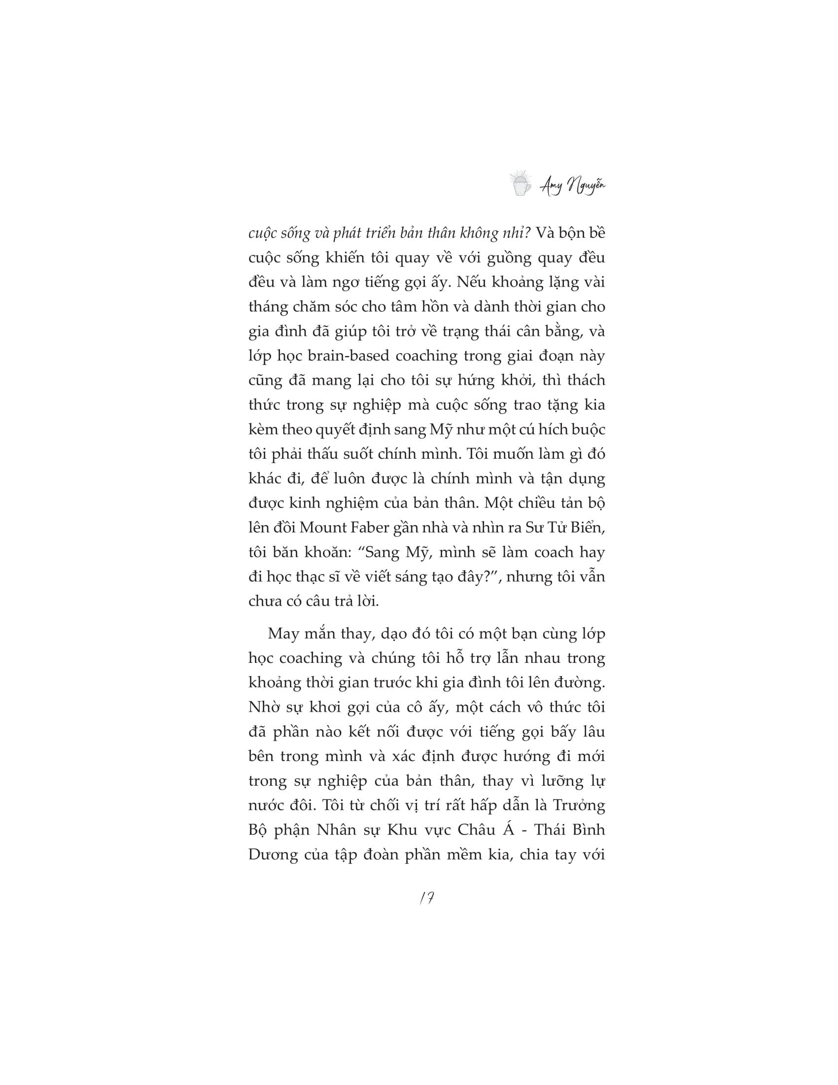 Amy Nguyễn là Chiến lược gia và Coach về Hạnh phúc Sự nghiệp – Cuộc sống. Cô đã hỗ trợ những người mẹ đến từ hơn 10 quốc gia từ châu Á, châu Âu và Mỹ bứt phá và nâng tầm hạnh phúc trong sự nghiệp và cuộc sống. Cô được cấp chứng chỉ là brain-based coach bởi Viện Neuroership có trụ sở tại New York, và là thành viên chính thức của Hội đồng Coaches của Forbes từ 2018 – 2022. Năm 2020, cô được tờ Business Insider đưa vào danh sách Most Innovative Coach trên toàn cầu và vào năm 2021, cô đồng thời được lọt vào vòng bán kết của danh sách Forbes Next 1000 dành cho những entrepreneur vẫn trụ vững trong mùa Covid. Cô cũng là diễn giả về hạnh phúc cho các tổ chức trong đó có IBM, WeWork, Hudson Montessori, Ellevate Network. Chia sẻ chuyên môn cũng như câu chuyện của Amy đã xuất hiện trên Forbes, Business Insider, NBC, Vietcetera và các ấn phẩm khác.
