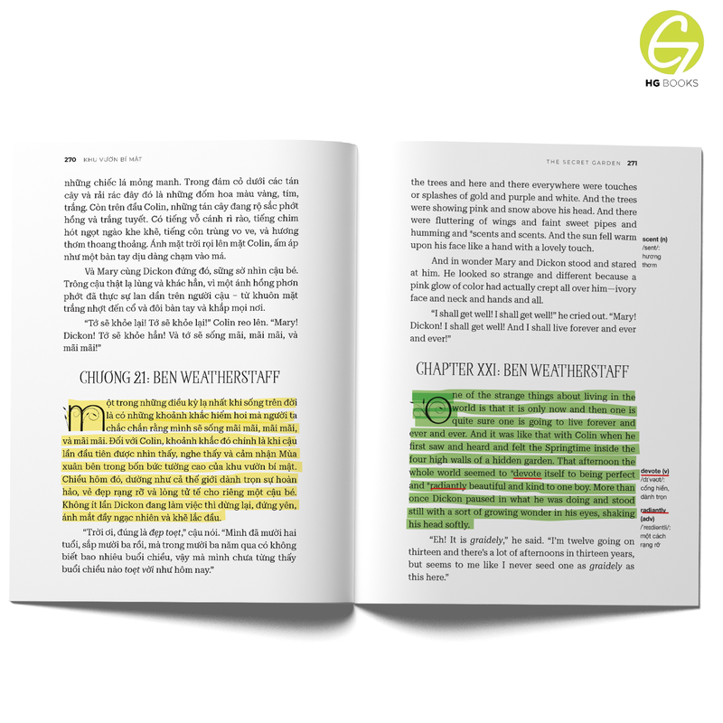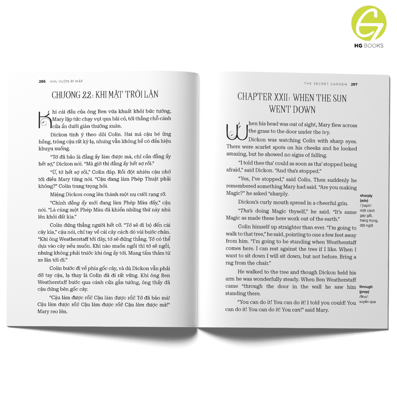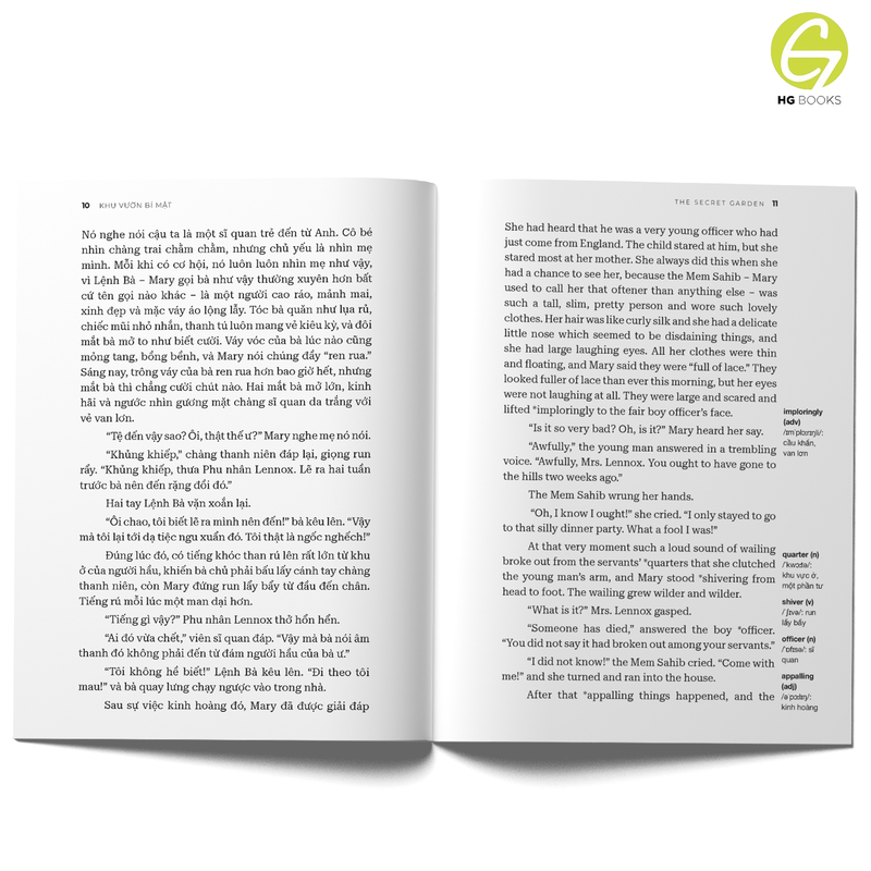 - Những điểm nổi bật của tác phẩm: Tác phẩm thiếu nhi kinh điển được yêu mến suốt hơn một thế kỷ The Secret Garden – Khu Vườn Bí Mật là một trong những cuốn sách văn học thiếu nhi vĩ đại nhất mọi thời đại. Không chỉ chạm đến trái tim trẻ em, mà còn khiến người lớn rung động bởi thông điệp dịu dàng và sâu sắc. Nguồn cảm hứng bất tận cho điện ảnh, sân khấu và nghệ thuật Ngay từ thập niên 1910, tác phẩm đã được chuyển thể thành nhiều phiên bản phim, hoạt hình, kịch sân khấu. Mỗi lần xuất hiện đều mang lại xúc cảm mới mẻ và được khán giả toàn thế giới đón nhận nồng nhiệt. Dịch ra hơn 50 ngôn ngữ – lan tỏa giá trị vượt thời gian Là một trong số ít tác phẩm thiếu nhi được chuyển ngữ rộng khắp, Khu Vườn Bí Mật tiếp tục gieo mầm yêu thương ở mọi nền văn hóa – như chính khu vườn từng bị lãng quên, rồi lại nở hoa rực rỡ. Phiên bản song ngữ Việt – Anh độc quyền từ HG Books Được biên dịch trau chuốt, dễ hiểu mà vẫn giữ nguyên vẻ đẹp văn chương. Kèm theo file nghe audio và phần ghi chú từ vựng – giúp các bạn nhỏ vừa thưởng thức tác phẩm kinh điển, vừa nâng cao khả năng tiếng Anh một cách tự nhiên, nhẹ nhàng.