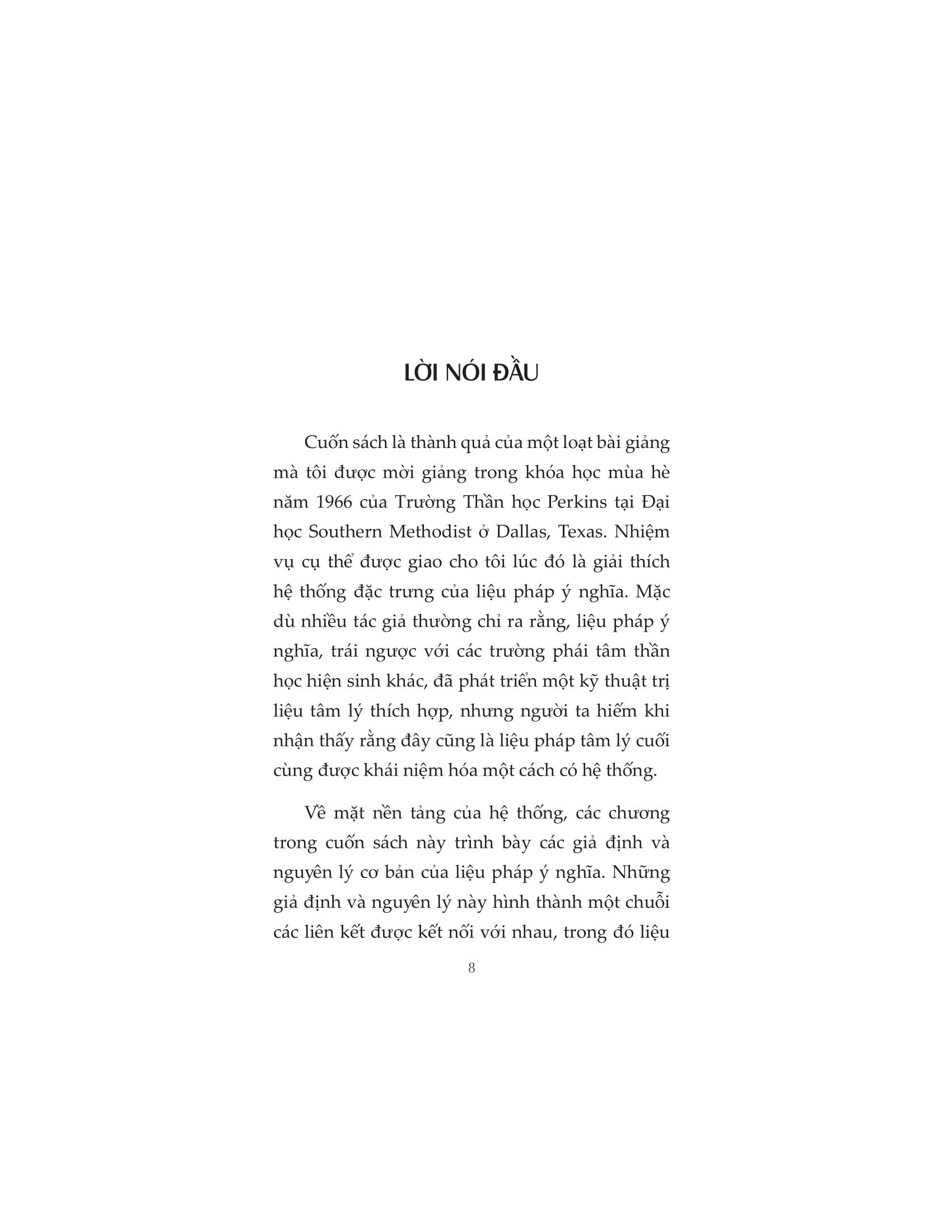 Trong cuốn sách Khủng hoảng hiện sinh - nhà thần kinh học người Áo Viktor E. Frankl đã hướng dẫn liệu pháp trị liệu tâm lý mang tên “liệu pháp ý nghĩa”. Ông quan niệm rằng, cuộc đời của ai cũng có một lẽ sống. Cuốn sách sẽ là một bức tranh toàn cảnh về những nguyên lý, tổng hợp tài liệu minh họa hình ảnh và những câu chuyện thực tế xoay quanh liệu pháp này. Viktor muốn truyền tải một niềm tin chắc chắn rằng, bất chấp sự sụp đổ của những lý lẽ thông thường, cuộc sống của mỗi người đều có những ý nghĩa riêng, và ý nghĩa đó vẫn sẽ luôn vẹn nguyên cho đến khi ta trút hơi thở cuối cùng.