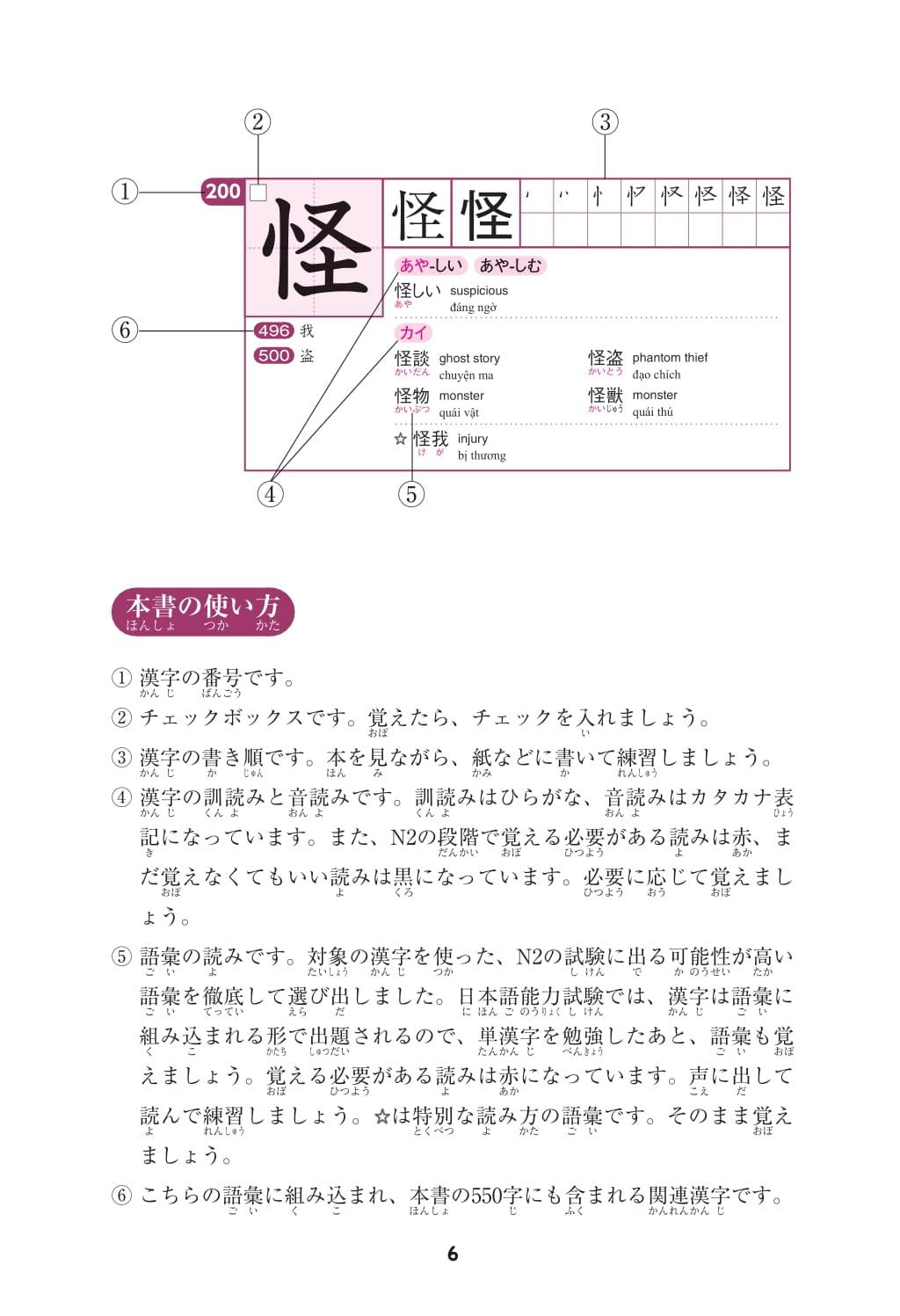 Bao gồm 550 chữ Hán tự thường được ra trong các Kỳ thi năng lực Nhật ngữ cấp độ N2. Bao gồm các đặc trưng: