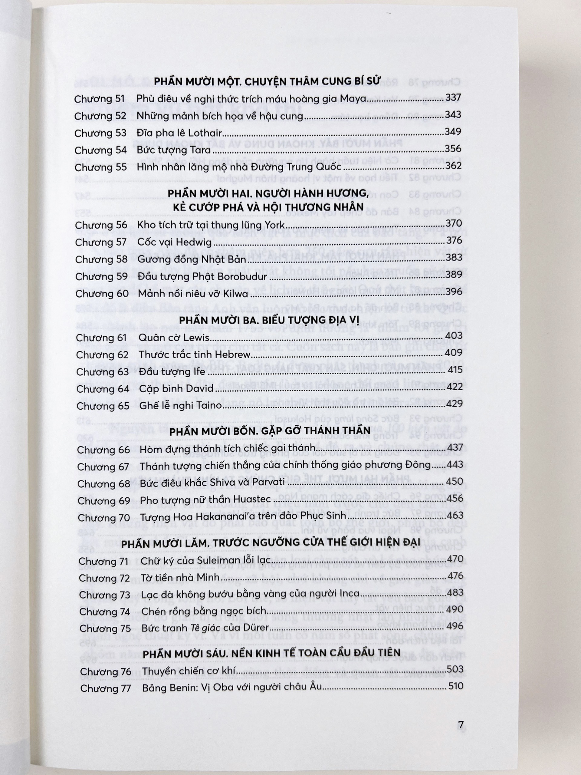 - Hình thức: Bìa mềm GIỚI THIỆU NỘI DUNG: “Lịch sử thế giới qua 100 hiện vật” được viết bởi Neil MacGregor - Nguyên Giám đốc Bảo tàng Anh (2003-2009) giúp chúng ta hiểu rõ hơn về quá trình phát triển của loài người bằng một góc nhìn mới lạ, đó là qua việc kể những câu chuyện lịch sử hấp dẫn, độc đáo xoay quanh các hiện vật tiêu biểu được trưng bày tại Bảo tàng Anh. Bảo tàng Anh được thành lập năm 1753 với định hướng là “nhắm tới giá trị phổ quát” và mở cửa tự do cho tất cả. Nơi đây đã có thâm niên hơn 250 năm sưu tầm hiện vật từ khắp thế giới, với gần 8.000.000 hiện vật được cất giữ và trưng bày tại đây, là các tác phẩm nghệ thuật vô giá và những báu vật của mọi nền văn minh của nhân loại trên thế giới – Ai Cập, Ba Tư, Hy Lạp, La Mã, Trung Hoa… Cuốn sách này là bản ghi chép từ chương trình trên đài BBC Radio 4, được phát thanh vào năm 2010, như một hoạt động đổi mới liên tục của Bảo tàng, mang lại cho Bảo tàng Anh giải thưởng “Bảo tàng của năm” (Art Fund Prize 2011). Bảo tàng và đài BBC đã chọn ra 100 hiện vật từ bộ sưu tập của Bảo tàng Anh và sắp xếp theo niên đại từ khởi nguồn lịch sử nhân loại vào khoảng hai triệu năm trước cho đến tận ngày nay. Những hiện vật đó bao quát toàn bộ thế giới, phân bố đều hết mức có thể, cố gắng đề cập đến càng nhiều khía cạnh thực tiễn trong trải nghiệm của nhân loại càng tốt, và kể cho chúng ta nghe về muôn mặt đời sống xã hội, chứ không chỉ về giới giàu sang quyền quý trong lòng nó. Bởi thế, số hiện vật này tất yếu bao gồm cả những món đồ giản dị trong đời sống thường nhật lẫn những công trình nghệ thuật kỳ vĩ. Một số hiện vật như: một công cụ chặt 2 triệu năm tuổi, một chiếc áo choàng bằng vàng của xứ Wales, tàu chiến cơ khí, tượng Phật ở Pakistan hay chiếc đồng hồ hàng hải trên tàu HMS Beagle.