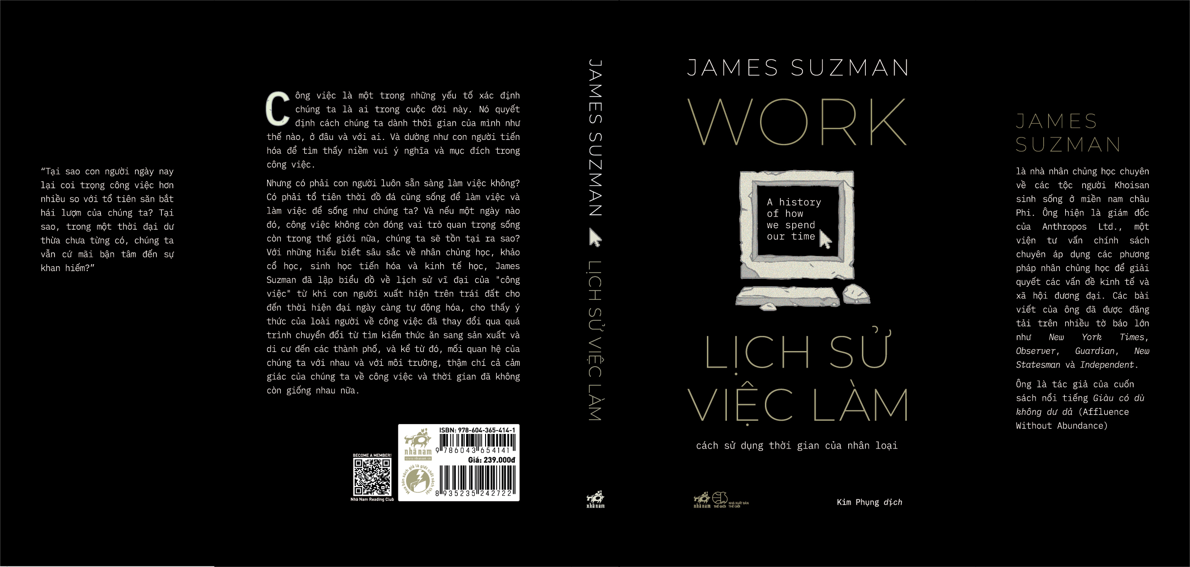 Với những hiểu biết sâu sắc về nhân chủng học, khảo cổ học, sinh học tiến hóa và kinh tế học, James Suzman đã lập biểu đồ về lịch sử vĩ đại của "công việc" từ khi con người xuất hiện trên trái đất cho đến thời hiện đại ngày càng tự động hóa, cho thấy ý thức của loài người về công việc đã thay đổi qua quá trình chuyển đổi từ tìm kiếm thức ăn sang sản xuất và di cư đến các thành phố, và kể từ đó, mối quan hệ của chúng ta với nhau và với môi trường, thậm chí cả cảm giác của chúng ta về công việc và thời gian đã không còn giống nhau nữa.