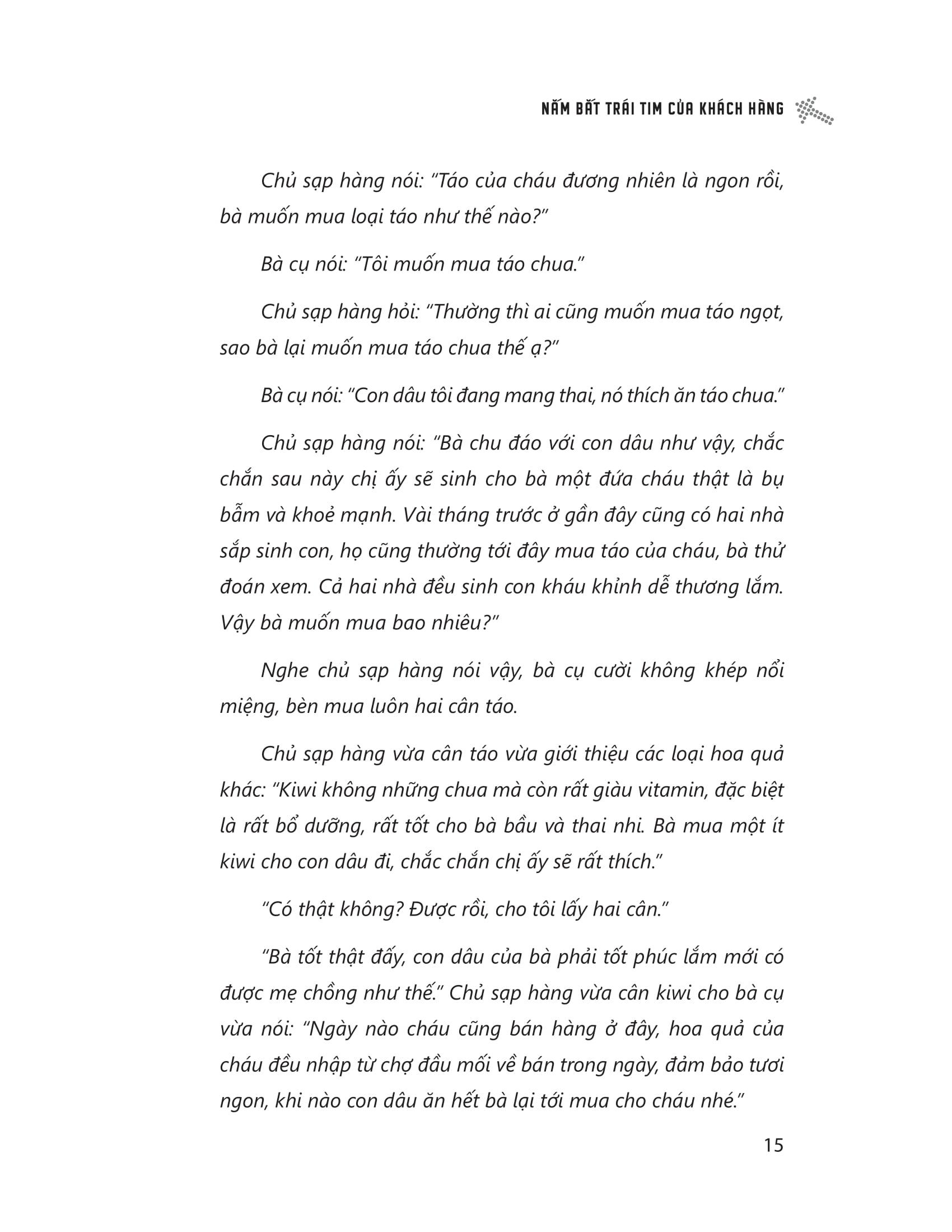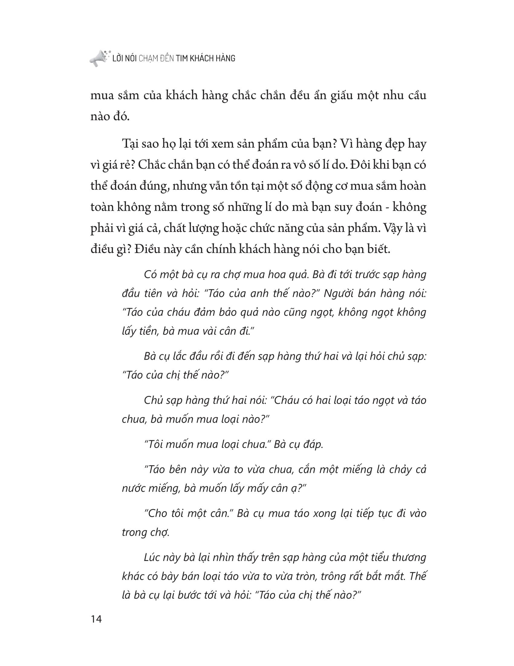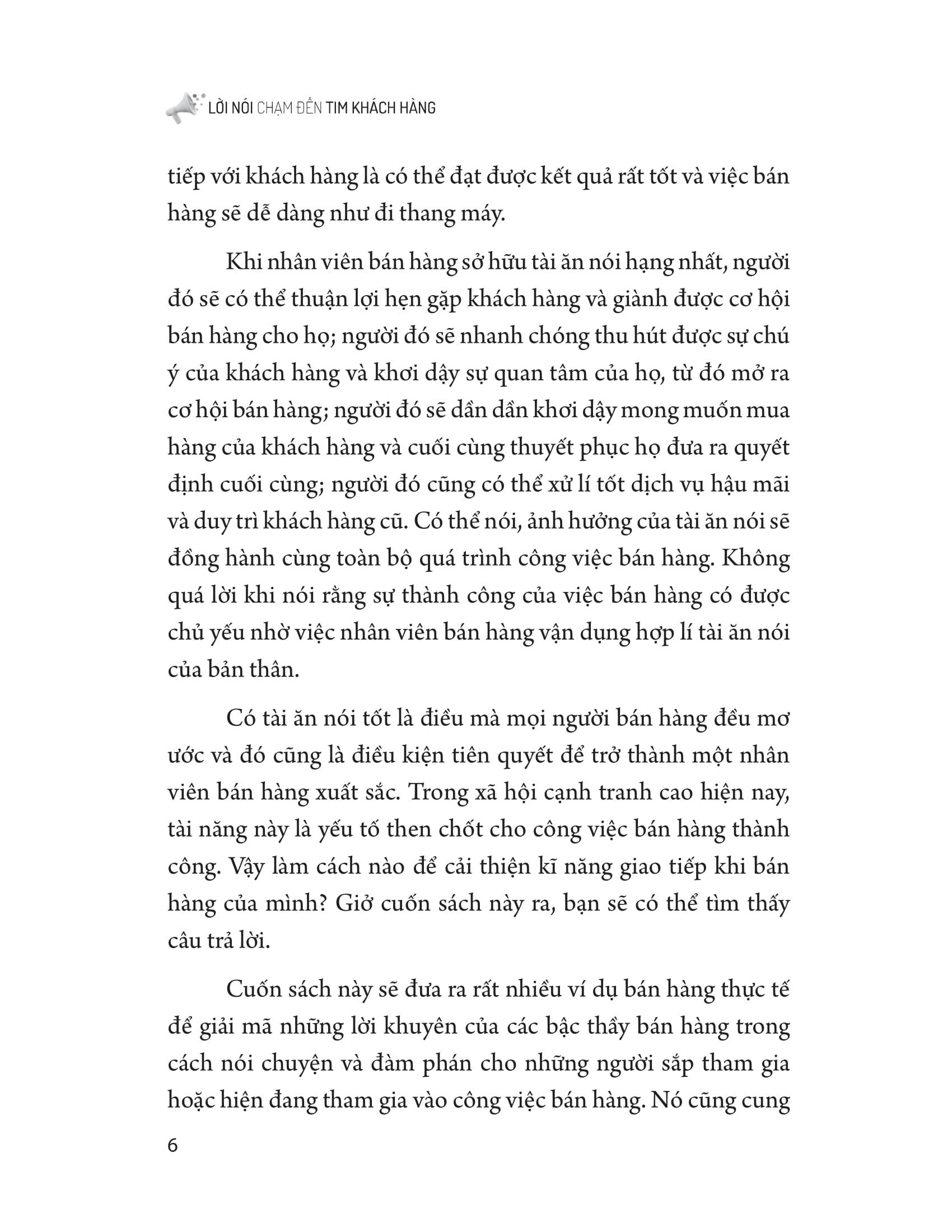 Cuốn sáchLời nói chạm đến tim khách hàngđưa ra rất nhiều ví dụ bán hàng thực tế để giải mã những lời khuyên của các bậc thầy bán hàng trong cách nói chuyện và đám phán cho những người sắp tham gia hoặc hiện đang tham gia vào công việc bán hàng. Bên cạnh đó, cuốn sách cung cấp những phương pháp thực tế và cụ thể để hướng dẫn mọi người cách vận dụng những lời khuyên này, từ đó nắm vững kĩ năng bán hàng xuất sắc!