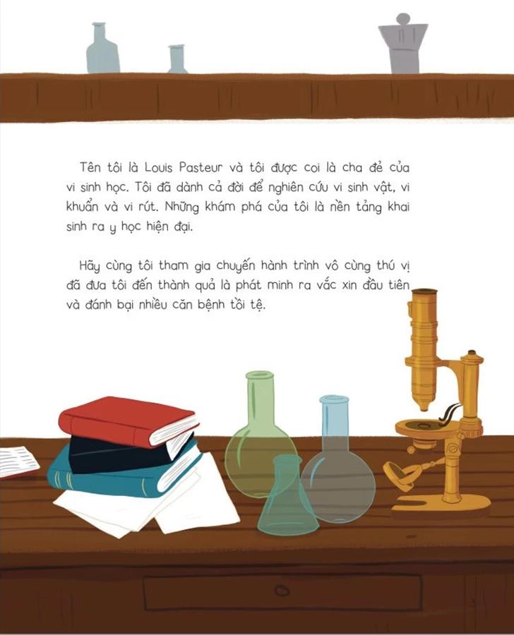 Louis Pasteur (White Star - Sách Bản Quyền Italy) Tên tôi là Louis Pasteur và tôi được coi là cha đẻ của vi sinh học. Tôi đã dành cả đời để nghiên cứu vi sinh vật, vi khuẩn và vi rút. Những khám phá của tôi là nền tảng khai sinh ra y học hiện đại. Hãy cùng tôi tham gia chuyến hành trình vô cùng thú vị đã đưa tôi đến thành quả là phát minh ra vắc xin đầu tiên và đánh bại nhiều căn bệnh tồi tệ.