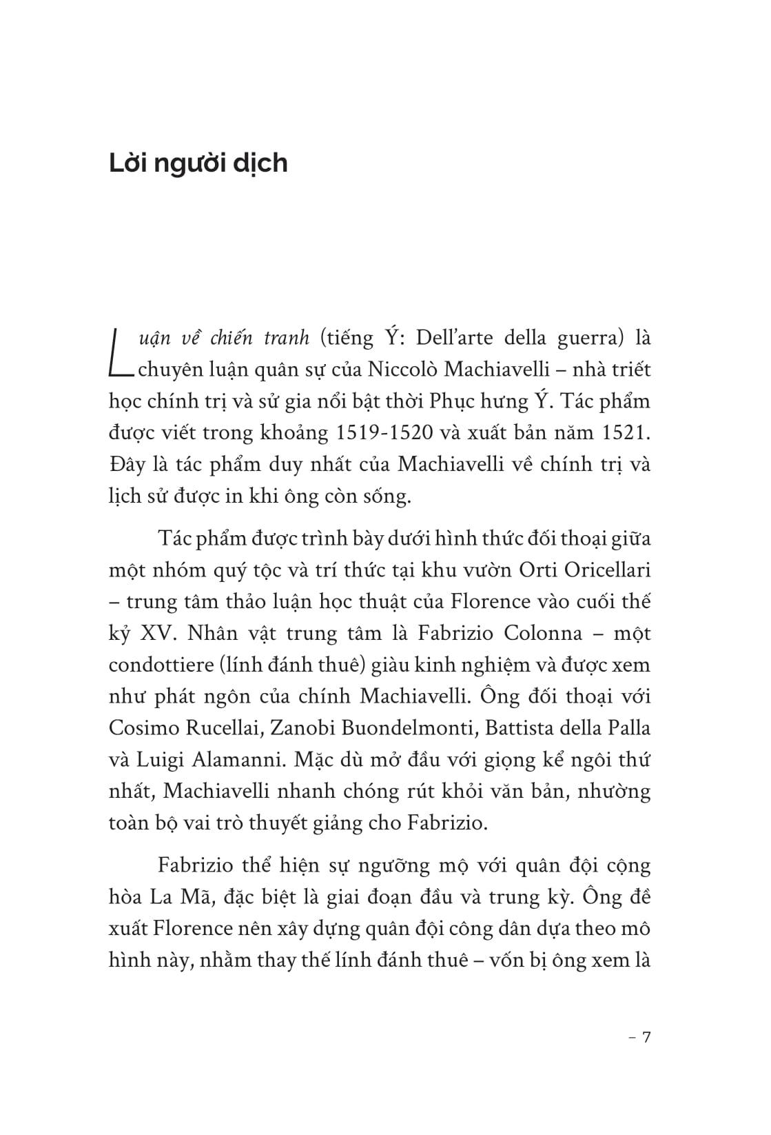 • (trích Quyển sáu) THÔNG TIN TÁC GIẢ Niccolò Machiavelli (1469-1527) Sinh tại thành phố Florence, Ý, được xem là sáng tổ của khoa học chính trị hiện đại. Ông phụng sự nền cộng hòa Florence, đảm nhận vị trí quan trọng trong ngoại giao và quân sự. Tác phẩm tiêu biểu: