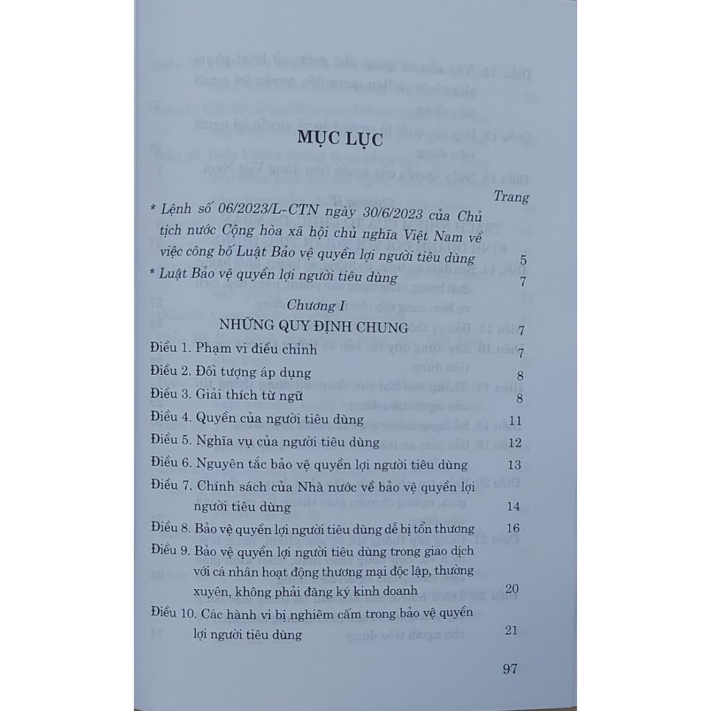 Mua tại TiktokSách - Luật Bảo Vệ Quyền Lợi Người Tiêu Dùng Tác giả: Quốc Hội Nhà xuất bản: Chính Trị Quốc Gia Sự Thật Ngày xuất bản: Tháng 08/ 2023 Số trang:103 trang Khổ sách: 13x19 cm Công ty phát hành: Nhà Sách Tư Pháp Giá bìa: 24.000đ Hình thức bìa: bìa mềm Lời giới thiệu: Luật Bảo Vệ Quyền Lợi Người Tiêu Dùng 2023 (Luật số: 19/2023/QH15) Luật này được Quốc hội nước Cộng hòa xã hội chủ nghĩa Việt Nam khóa XV, kỳ họp thứ 5 thông qua ngày 20 tháng 6 năm 2023 gồm 7 Chương, 82 Điều có hiệu lực thi hành ngày 01-07-2024