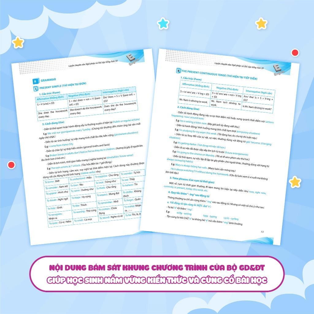- Tích hợp nhiều mẹo giải hay, dễ dàng vận dụng, dễ nhớ sẽ giúp em làm bài nhanh hơn, đạt điểm cao hơn Luyện Chuyên Sâu Ngữ Pháp Và Bài Tập Tiếng Anh 10 phù hợp với tất cả các đối tượng học sinh có học lực từ trung bình đến khá, giỏi. Cuốn sách sẽ luôn là người bạn đồng hành giúp em chinh phục bài kiểm tra, bài thi Tiếng Anh 10.