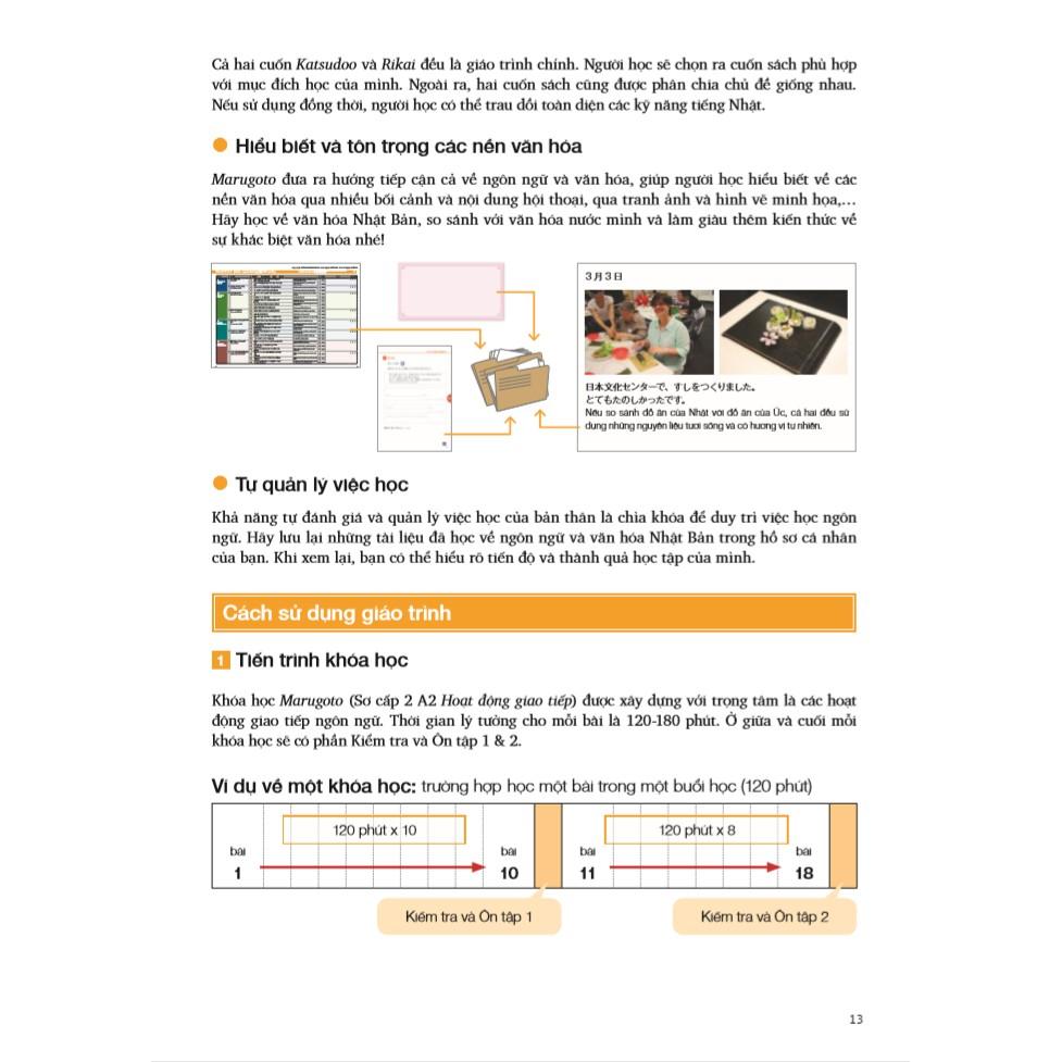 Giáo trình Marugoto - Ngôn ngữ và Văn hóa Nhật Bản được triển khai dựa trên Chuẩn Giáo dục tiếng Nhật JF. Tựa đề Marugoto, có nghĩa là “trọn vẹn”, chứa đựng thông điệp: sự kết hợp hài hòa giữa ngôn ngữ và văn hóa. Giáo trình này giới thiệu những tình huống giao tiếp thực tế, giúp người học trải nghiệm nhiều khía cạnh đa dạng của văn hóa Nhật Bản và đặc trưng trong đời sống của người Nhật một cách trọn vẹn.