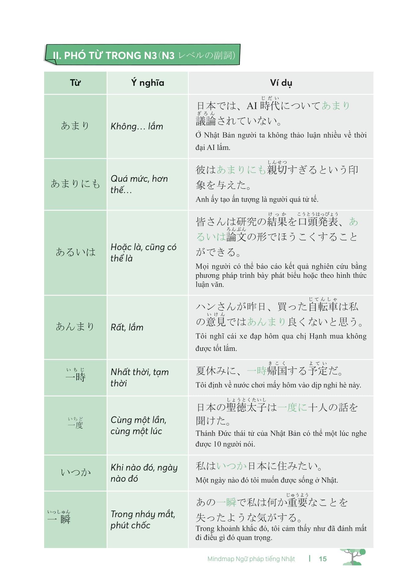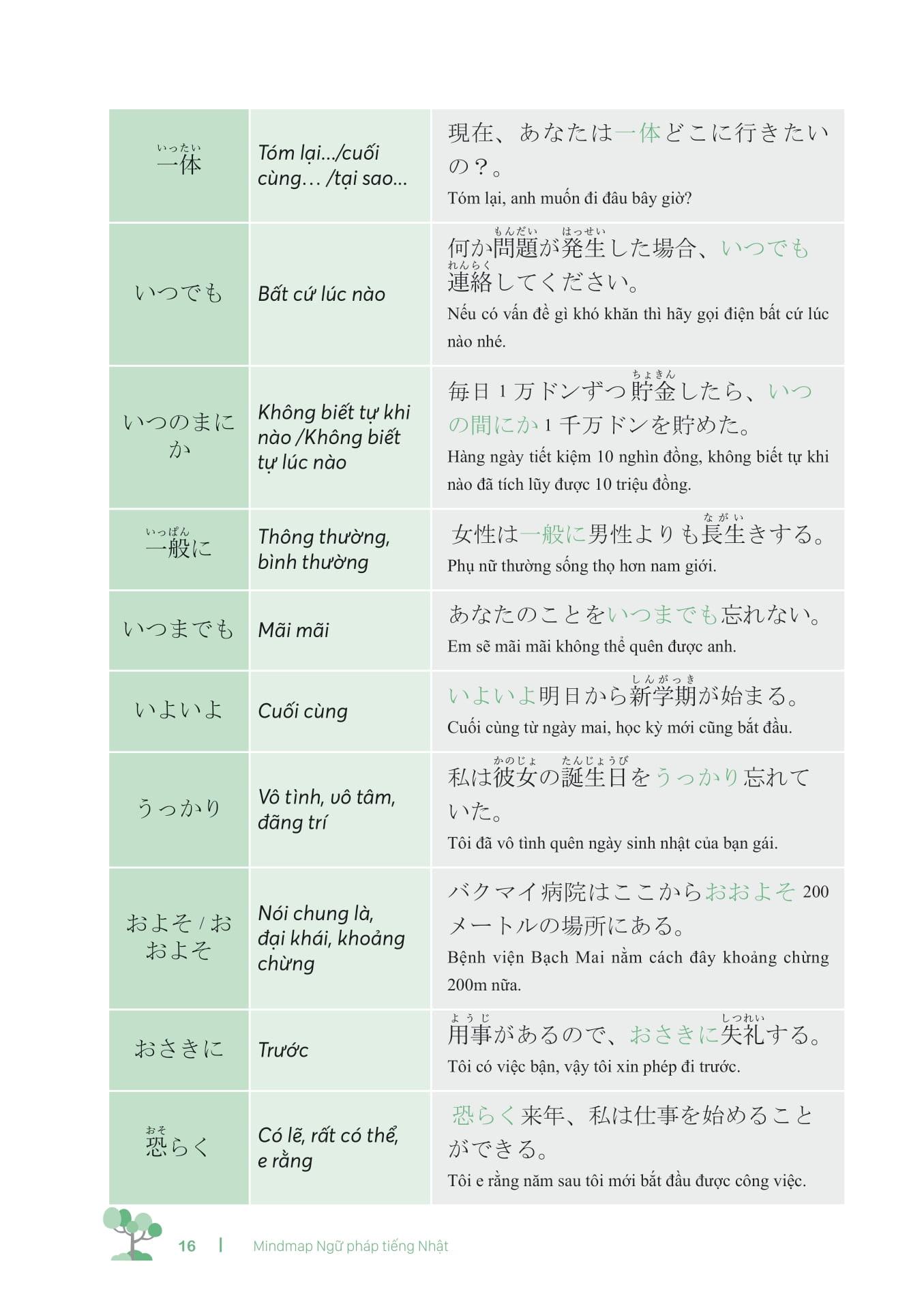 - Luyện tập qua các bài thi đánh giá năng lực về ngữ pháp, học cùng kỹ năng giao tiếp. Mind Map Ngữ Pháp Tiếng Nhật Trung Cấp là cuốn sách không thể bỏ qua đối với các bạn đang có mục đích học tiếng Nhật trung cấp hoặc có ý định thi lấy chứng chỉ JLPT N3. Phương pháp học Ngữ pháp tiếng Nhật bằng sơ đồ tư duy Ngữ pháp là một trong những yếu tố tiên quyết để hoàn thiện đầy đủ kỹ năng của tiếng Nhật. Vì vậy, việc nắm rõ, biết cách ứng dụng và ghi nhớ ngữ pháp là việc rất quan trọng. Điều này đặc biệt quan trọng với những bạn có mục tiêu lấy chứng chỉ tiếng Nhật nói chung và các bạn chuẩn bị tham gia kỳ thi năng lực trình độ trung cấp nói riêng. Nếu bạn đang gặp khó khăn trong việc tiếp thu và ghi nhớ kiến thức bằng cách học liệt kê, thì phương pháp sơ đồ tư duy (Mind Map) là giải pháp thay thế hiệu quả, giúp bạn hệ thống lại và ghi nhớ lâu các dạng cấu trúc ngữ pháp theo từng chủ điểm, tạo ra sự liên kết các cấu trúc theo từng dạng. Qua đó, các bạn dễ dàng và nhanh chóng làm chủ được những kiến thức cần thiết. Không chỉ dừng lại ở kiến thức bài vở trên đề thi mà cuốn sách này còn giúp bạn có thể học cách giao tiếp với người Nhật Bản một cách tự nhiên và hiệu quả. Nội dung của cuốn sách Mind Map Ngữ Pháp Tiếng Nhật – Học Ngữ Pháp Tiếng Nhật Qua Sơ Đồ Tư Duy dành cho Trình độ Trung Cấp: Phần 1 – Tổng hợp ngữ pháp JLPT trình độ Trung Cấp N3: trợ từ và phó từ tiếng Nhật Phần 2 – Các chủ điểm ngữ pháp trình độ Trung Cấp: 27 chủ điểm ngữ pháp với mỗi chủ điểm là nội dung bài học bao gồm: