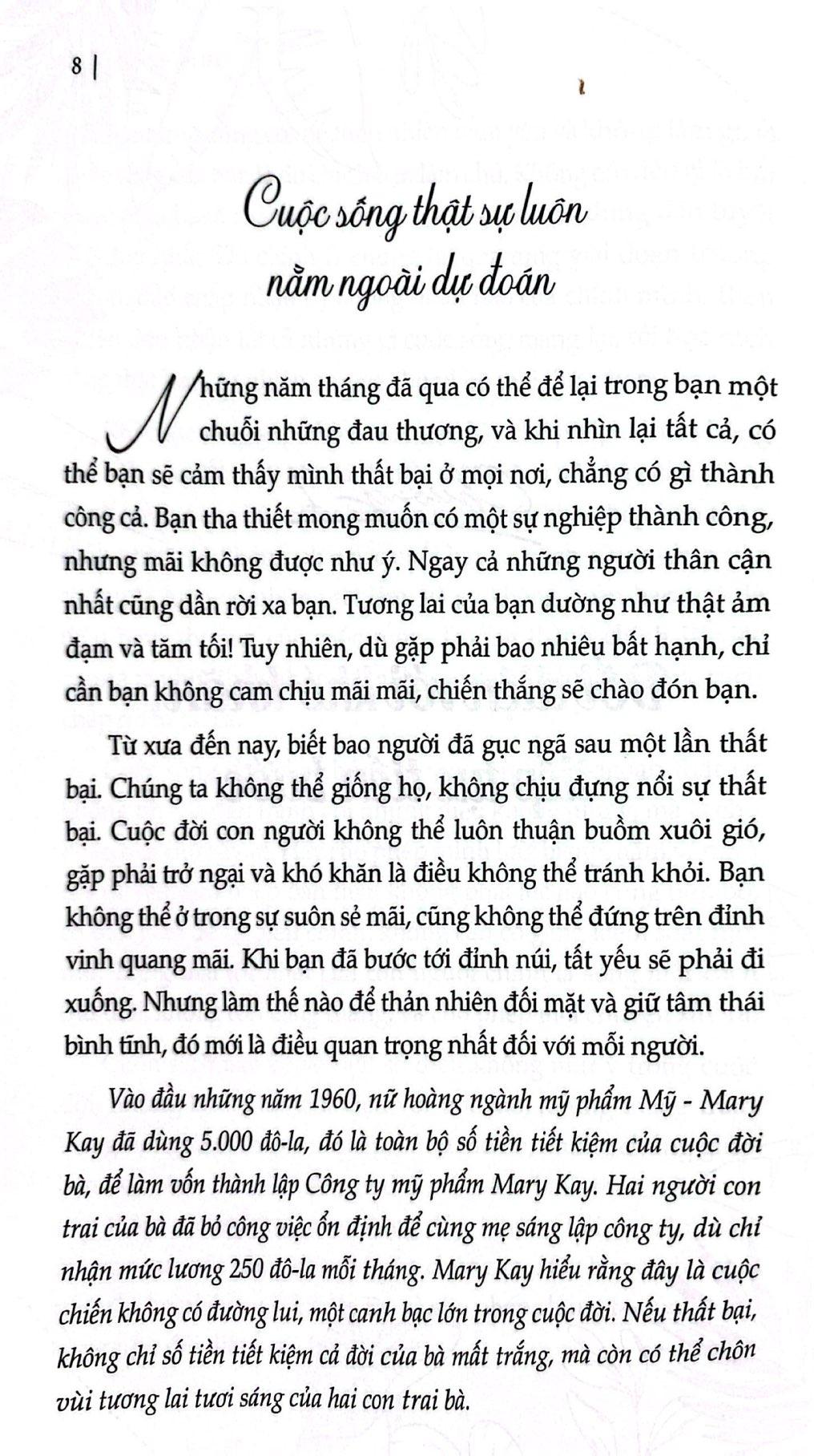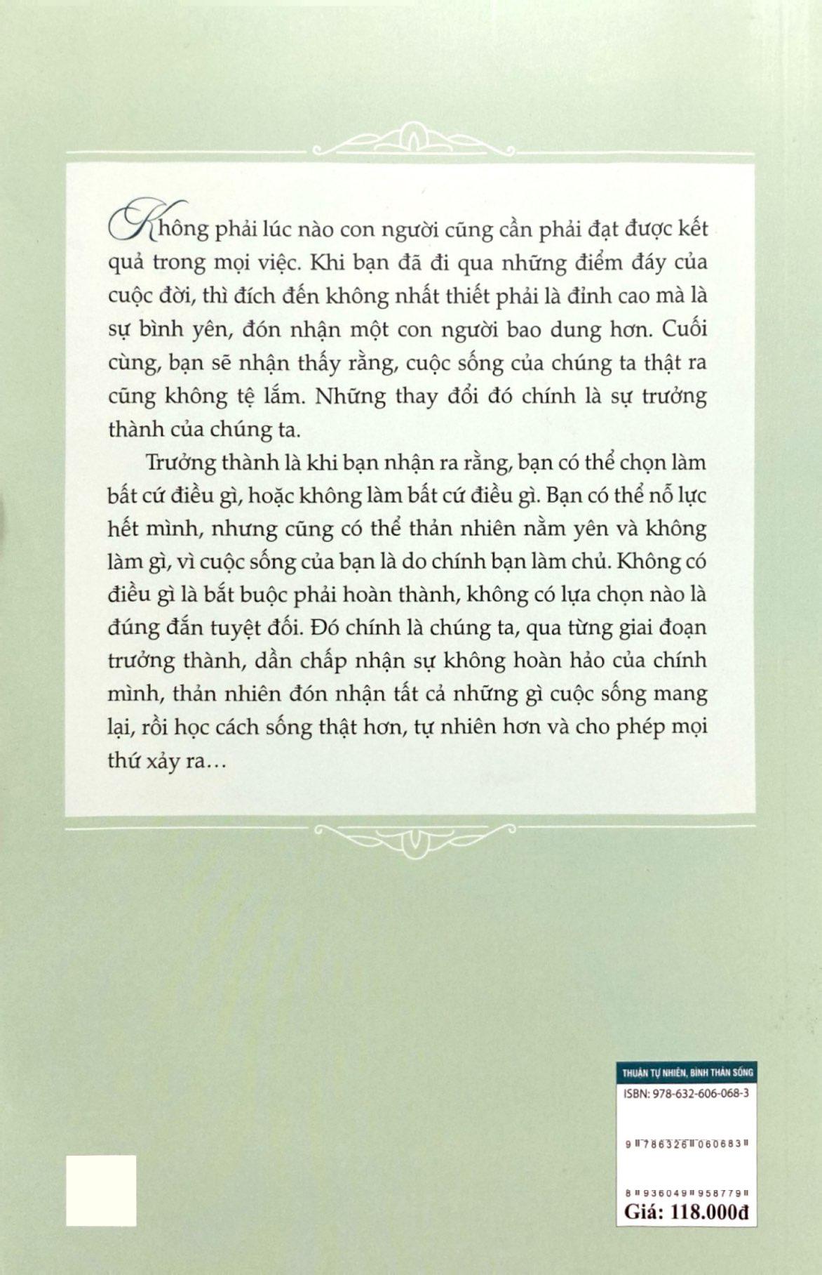 Một Đời An Lạc - Thuận Tự Nhiên, Bình Thản Sống Không phải lúc nào con người cũng cần phải đạt được kết quả trong mọi việc. Khi bạn đã đi qua những điểm đáy của cuộc đời, thì đích đến không nhất thiết phải là đỉnh cao mà là sự bình yên, đón nhận một con người bao dung hơn. Cuối cùng, bạn sẽ nhận thấy rằng, cuộc sống của chúng ta thật ra cũng không tệ lắm. Những thay đổi đó chính là sự trưởng thành của chúng ta. Trưởng thành là khi bạn nhận ra rằng, bạn có thể chọn làm bất cứ điều gì, hoặc không làm bất cứ điều gì. Bạn có thể nỗ lực hết m.ình, nhưng cũng có thể thản nhiên nằm yên và không làm gì, vì cuộc sống của bạn là do chính bạn làm chủ. Không có điều gì là bắt buộc phải hoàn thành, không có lựa chọn nào là đúng đắn tuyệt đối. Đó chính là chúng ta, qua từng giai đoạn trưởng thành, dần chấp nhận sự không hoàn hảo của chính m.ình, thản nhiên đón nhận tất cả những gì cuộc sống mang lại, rồi học cách sống thật hơn, tự nhiên hơn và cho phép mọi thứ xảy ra...