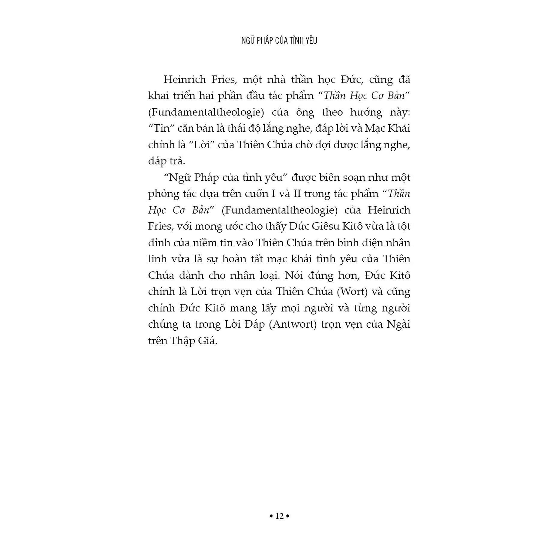 “Ngữ Pháp của tình yêu” được biên soạn như một phỏng tác dựa trên cuốn I và II trong tác phẩm “Thần Học Cơ Bản” (Fundamentaltheologie) của Heinrich Fries, với mong ước cho thấy Đức Giêsu Kitô vừa là tột đỉnh của niềm tin vào Thiên Chúa trên bình diện nhân linh vừa là sự hoàn tất mạc khải tình yêu của Thiên Chúa dành cho nhân loại. Nói đúng hơn, Đức Kitô chính là Lời trọn vẹn của Thiên Chúa (Wort) và cũng chính Đức Kitô mang lấy mọi người và từng người chúng ta trong Lời Đáp (Antwort) trọn vẹn của Ngài trên Thập Giá.