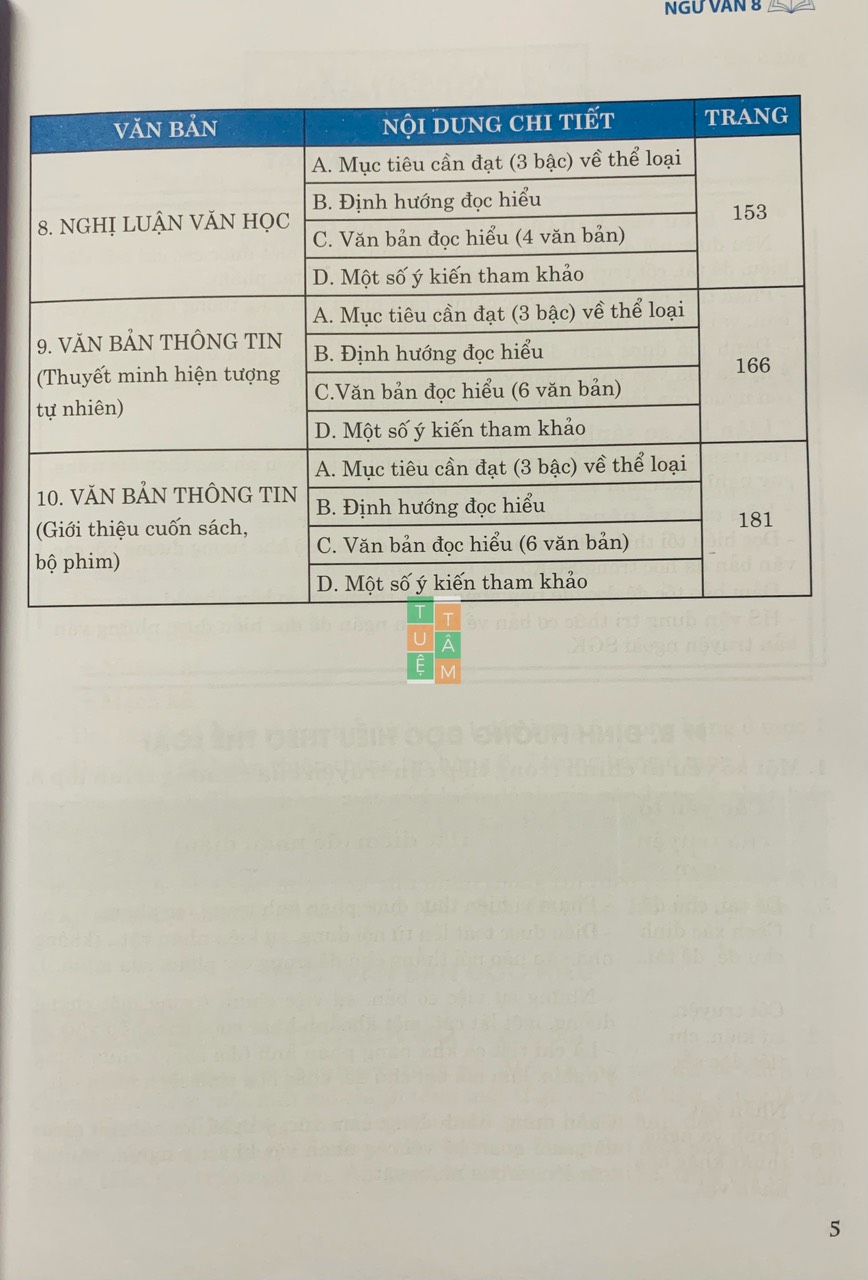 Cuốn sách gồm 10 đơn vị bài ứng với 10 thể loại/tiểu loại (đọc hiểu) của chương trình Ngữ văn 8 thuộc 3 kiểu văn bản chính.