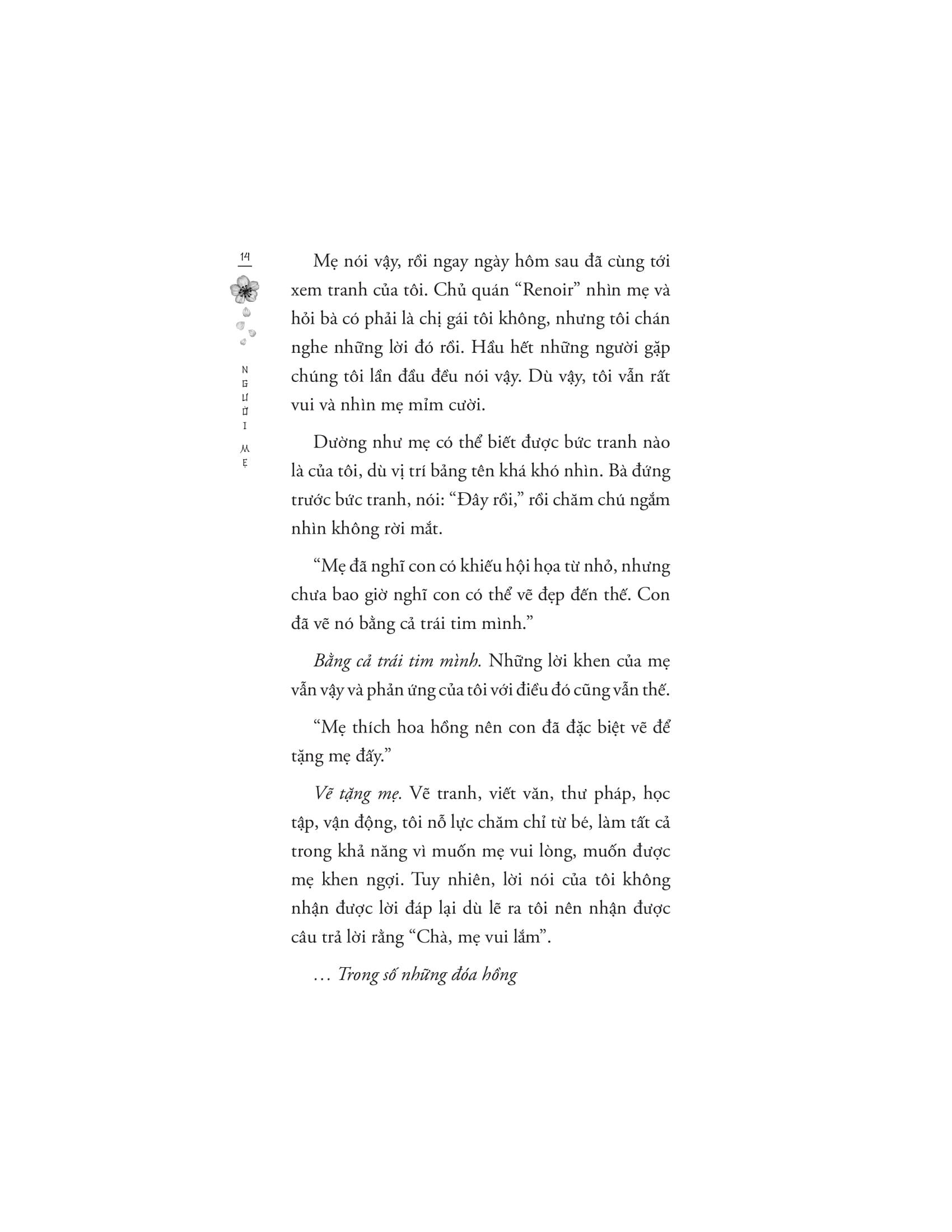 Nhưng mà, khi sinh con ra, mẹ đã nghĩ rằng dù mẹ không thể để lại bất cứ thứ gì, thì con của mẹ vẫn sẽ có thể để lại thứ gì đó. Nếu đứa trẻ ấy không thể, thì đứa con mà nó sinh ra sẽ tiếp nối. Nhưng điều đó xảy ra là vì có sự tồn tại của mẹ.”