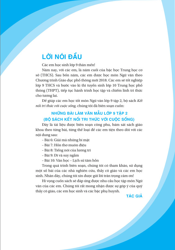 Hi vọng cuốn sách sẽ đáp ứng được nhu cầu học tập môn Ngữ văn của các em. Chúng tôi rất mong nhận được sự góp ý của quý thầy cô giáo, các em học sinh và các bậc phụ huynh.