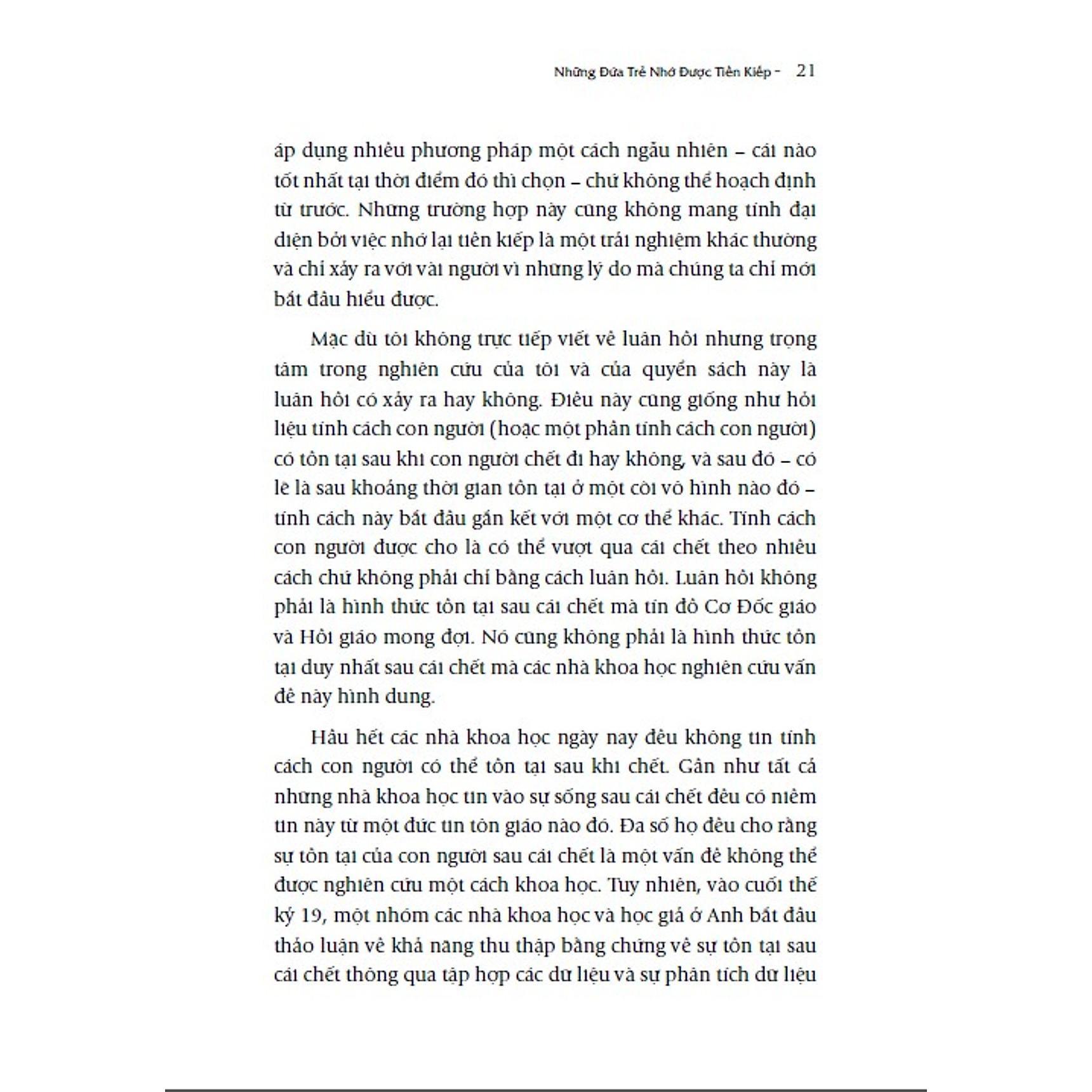 “Những đứa trẻ nhớ được tiền kiếp” không trực tiếp bàn về luân hồi mà hướng trọng tâm đến việc nghiên cứu các dấu hiệu chứng tỏ ký ức của một người vẫn tồn tại sau khi chết. Thông qua 11 chương sách, tác giả đã đưa ra nhiều bằng chứng khoa học thuyết phục nhất chứng minh ký ức của chúng ta vẫn tồn tại sau khi chết. Ông tin rằng, con người có thể nhớ lại tiền kiếp sau khi được tái sinh vào một kiếp sống mới.