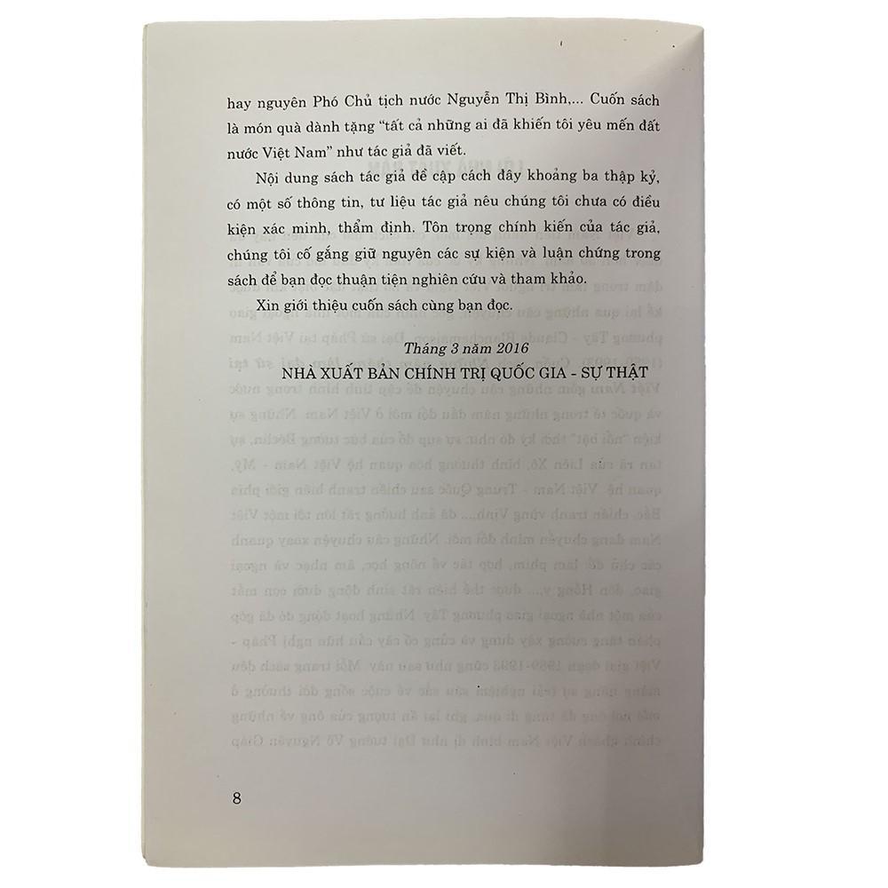 Mua tại TiktokNhà xuất bản: Nhà xuất bản Chính trị quốc gia Sự thật Tác giả: CLAUDE BLANCHEMAISON Năm xuất bản: 2016 Số trang: 160 Cuốn sách là câu chuyện của một nhà ngoại giao phương Tây, Đại sứ Pháp tại Việt Nam (1989-1993). Cuốn sách gồm những câu chuyện trong nước và quốc tế trong những năm đầu đổi mới ở Việt Nam qua góc nhìn của một người nước ngoài. Mỗi trang sách đều mang nặng sự trải nghiệm về cuốc sống đời thường ở mỗi nơi mà ông đi qua, ghi lại ấn tượng của ông về những chính khách Việt Nam bình dị như Đại tướng Võ Nguyên Giáp, nguyên Phó Chủ tịch nước Nguyễn Thị Bình...