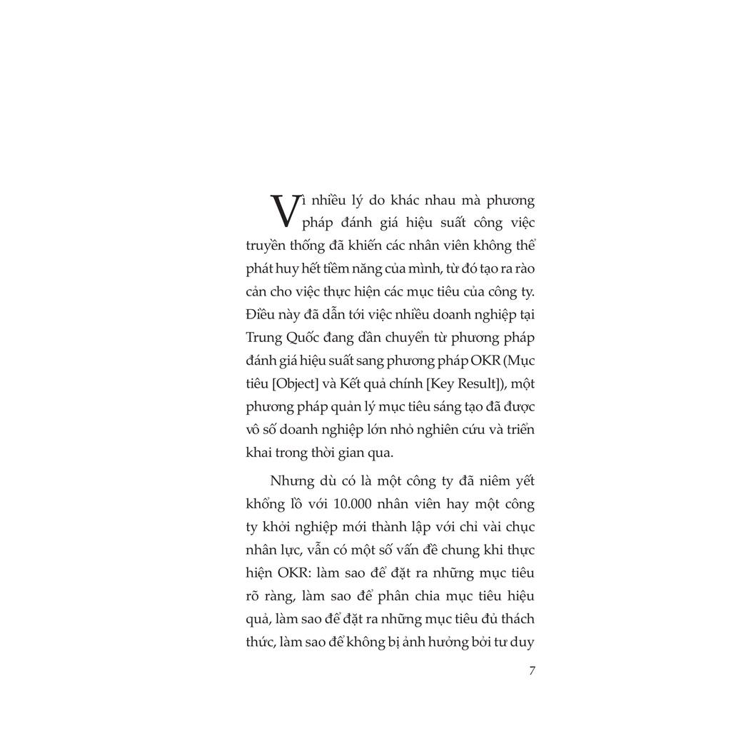 - Nâng cao hiệu suất công việc Cuốn sách cung cấp các khái niệm căn bản nhất về OKR, phù hợp cho những người mới tiếp cận và tìm hiểu về phương pháp quản lý này. Sách gồm 6 chương: Chương 1. Những môi trường nào có thể khiến OKR phát huy được tối đa hiệu quả. Chương 2. Thiết lập và chia nhỏ mục tiêu theo định hướng chiến lược. Chương 3. Tính thách thức của các kết quả chính. Chương 4. Cách dùng OKR để thúc đẩy cá nhân. Chương 5. Xung đột giữa OKR và đánh giá hiệu suất. Chương 6. Sự tồn tại song song của OKR và đánh giá hiệu suất.