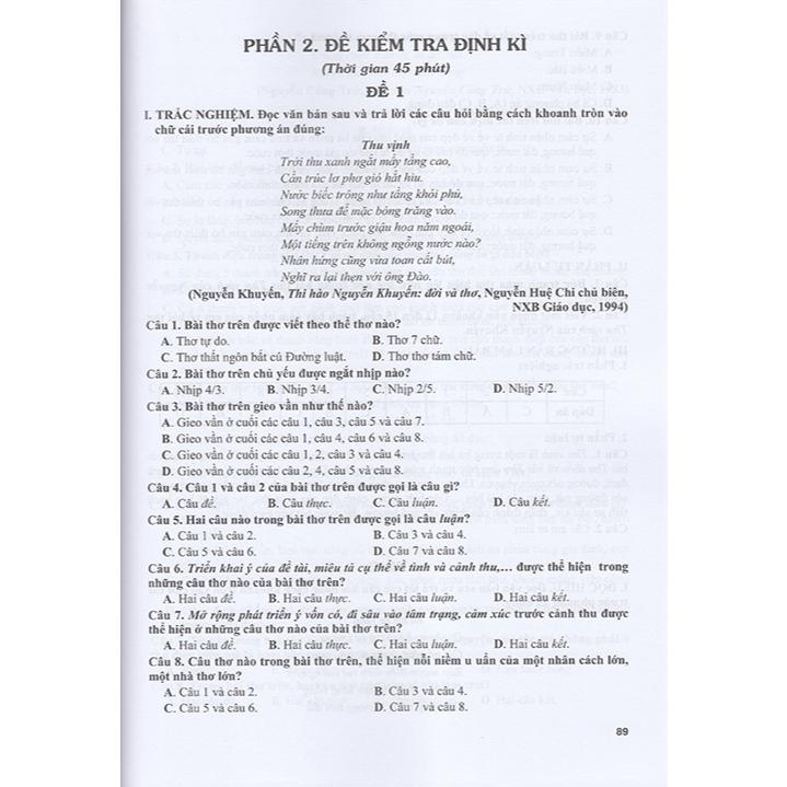 Phần các đề kiểm tra định kỳ có 40 đề, được chia thành đề kiểm tra 1 tiết (thời gian làm bài 45 phút) và đề kiểm tra 2 tiết (thời gian làm bài 90 phút). Mỗi đề luyện tập có thể là một đoạn văn, đoạn thơ hoặc một văn bản được lấy làm ngữ liệu để xây dựng các dạng câu hỏi. Nội dung các câu hỏi đi từ các mức độ nhận thức của học sinh như: Nhận biết, Thông hiểu, Vận dụng, Vận dụng cao. Phần viết có nhiều kiểu bài, sẽ giúp các em có thêm những khám phá thú vị khi luyện viết các đoạn văn và bài làm văn khác nhau nhằm nâng cao năng lực ngôn ngữ và năng lực Ngữ văn của mình. Đặc biệt, phần cung cấp các đoạn văn, bài văn tham khảo sẽ giúp các em rút ra được những bài học, những kinh nghiệm trong việc nâng cao kỹ năng viết văn của mình. Với 72 đề ôn luyện Ngữ văn, cuốn Ôn tập - Kiểm tra nâng cao và phát triển năng lực Ngữ văn 8, tập một, được biên soạn bám sát các chủ đề có trong Chương trình Ngữ văn mới, có mở rộng và có nâng cao thêm các ngữ liệu ngoài chương trình, phù hợp với yêu cầu đổi mới kiểm tra, đánh giá môn Ngữ văn theo định hướng phát triển năng lực học sinh.