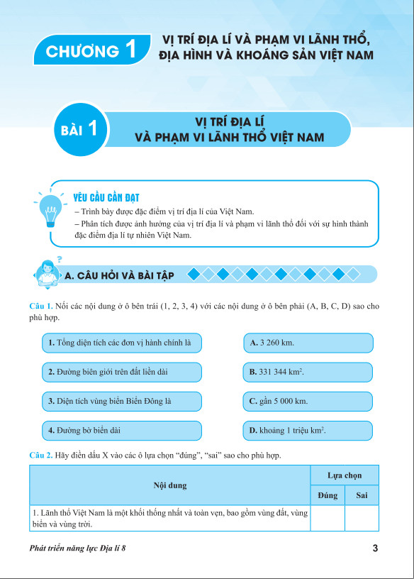 Trong mỗi bài, các em sẽ gặp các dạng câu hỏi và bài tập: tự luận, làm việc với hình (sơ đồ, lược đồ, bản đồ, biểu đồ, tranh ảnh, bảng số liệ); ghép nối (nối các ô với nhau); diễn nội dung (điền vào câu thiếu hoặc cột trống của bảng, ô trống của sơ đồ); câu hỏi trắc nghiệ Các dạng câu hỏi khác nhau giúp các em rèn luyện và phát triển các năng lực địa lí khác nhau: Nhận thức địa lí, tin hiểu địa lí, vận dụng kiến thức, kĩ năng đã học vào thực tiễn.