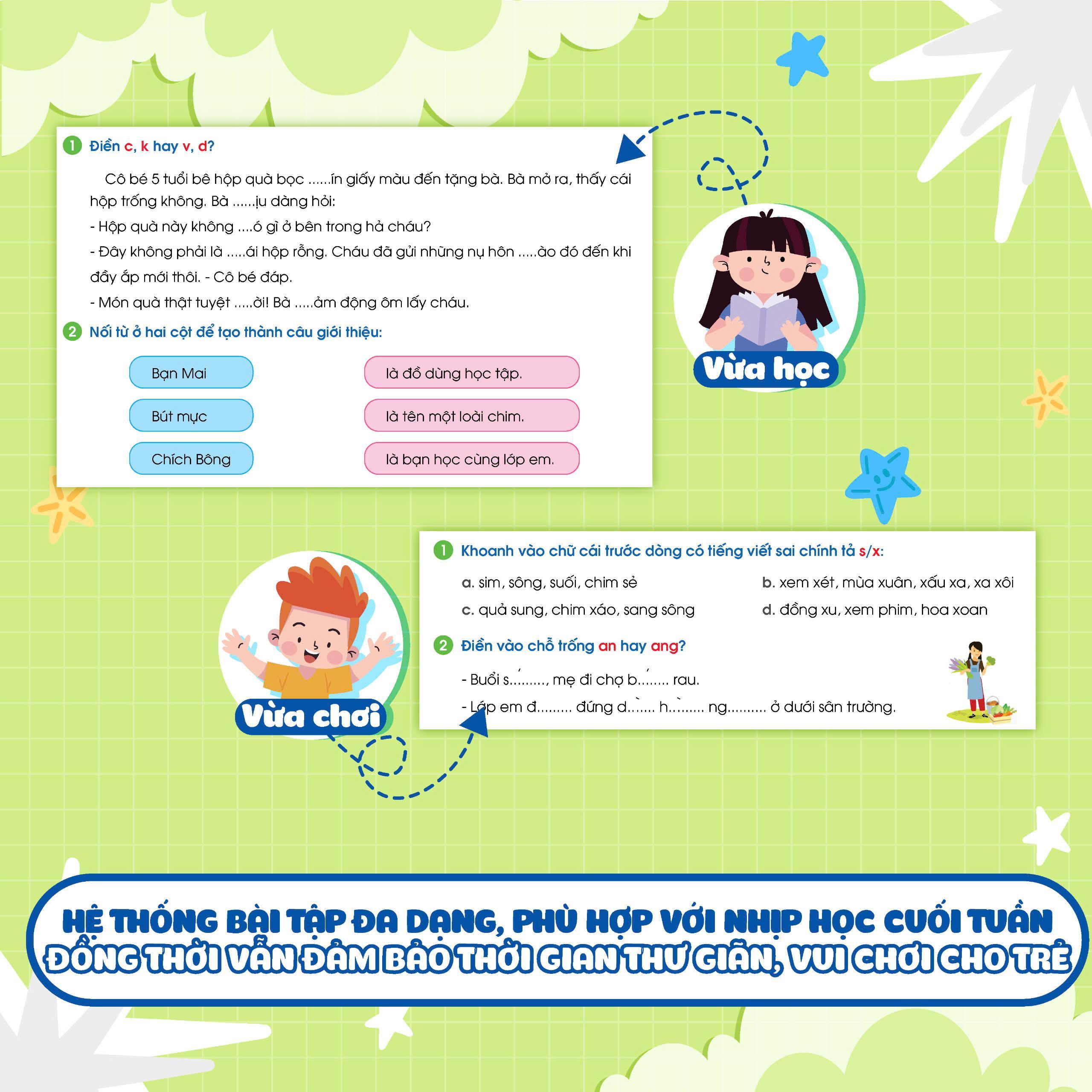 Sách được thiết kế với bố cục dễ hiểu với nhiều hình ảnh và được in màu sinh động giúp các con hứng thú với việc học vào những ngày cuối tuần.