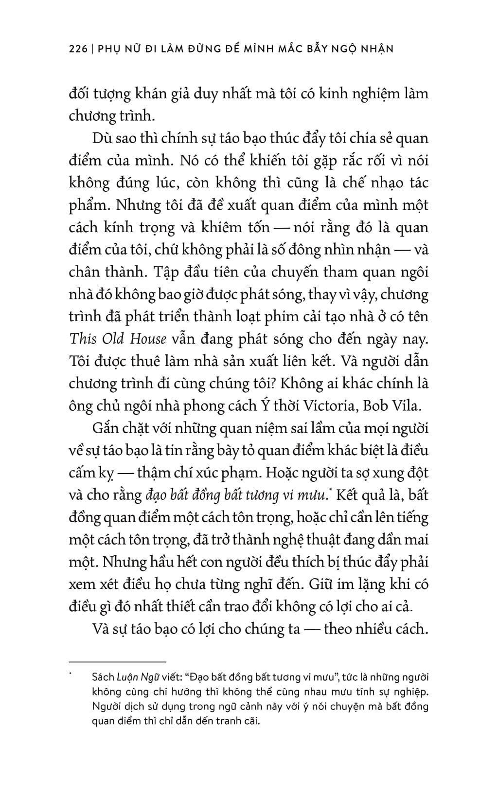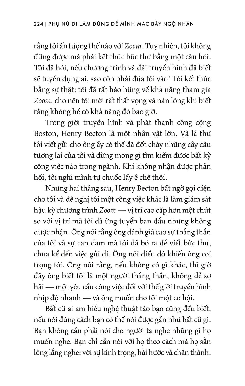 “Nữ hoàng truyền hình cáp” Bonnie Hammer viết Phụ nữ đi làm đừng để m.ình mắc bẫy ngộ nhận không phải để bày cách cho tất cả phụ nữ vươn lên thành lãnh đạo. Mà là vươn lên thành tài sản giá trị của nơi làm việc — loại giá trị sẽ giữ bạn sinh tồn qua mọi bể dâu khủng hoảng do thay đổi của tổ chức và ngành nghề! Cô đã nói trong sách: “Cuộc đời của chúng ta cũng là nền tảng để kể chuyện — và nếu được tận dụng tối đa, những câu chuyện đời sẽ thú vị hơn nhiều (cũng như thực tế và bổ ích hơn nhiều) so với bất kỳ câu chuyện gì trên màn ảnh… Cuốn sách này cung cấp cho bạn các công cụ và sự thật (và thái độ) bạn cần để nắm quyền kiểm soát câu chuyện của m.ình và tự viết những chương tiếp theo.”