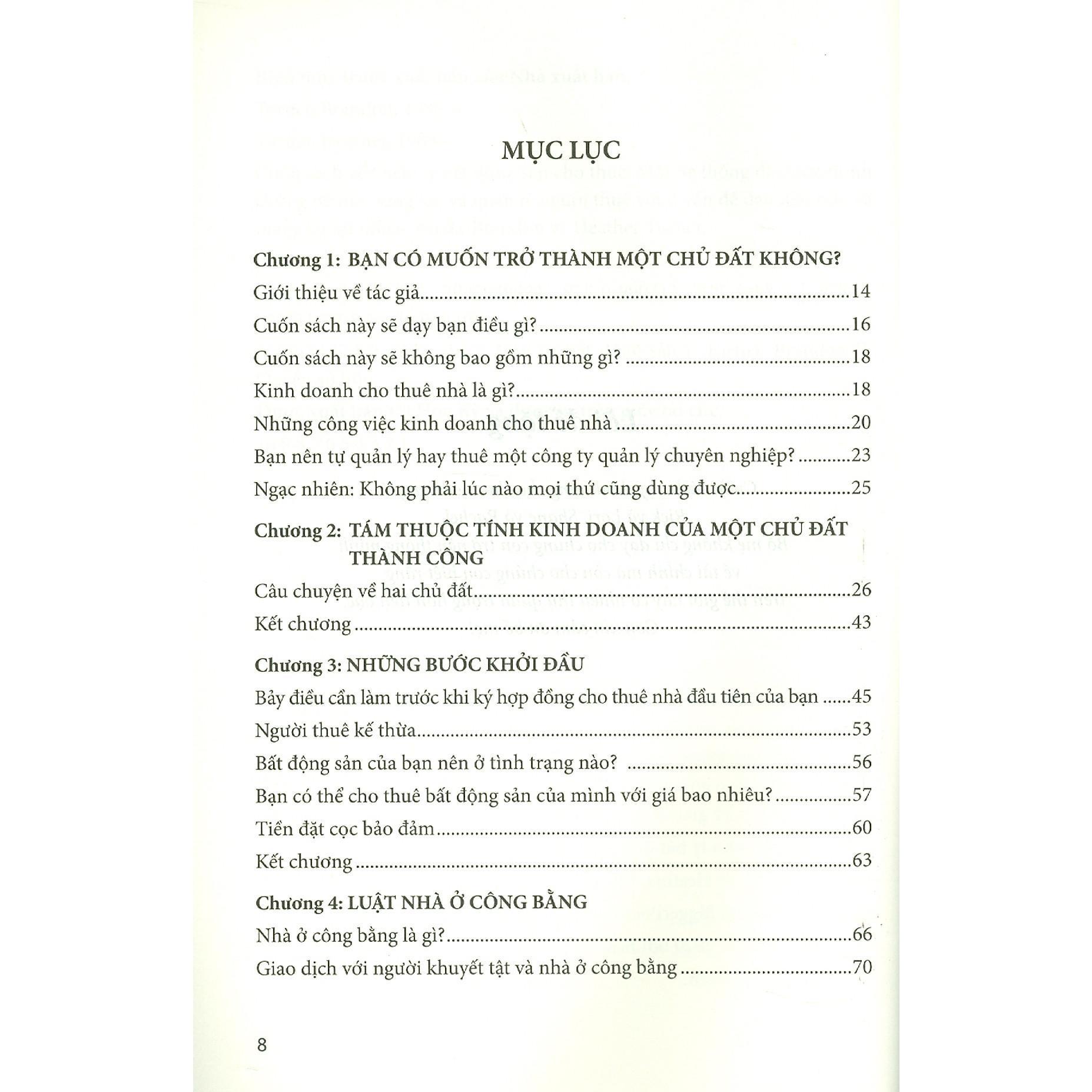 Đúng vậy, kinh doanh nhà cho thuê hiệu quả có thể hoàn thành tất cả mục tiêu này và theo những cách mạnh mẽ. Bạn có thể là chủ đất lần đầu, chỉ gặp khó khăn khi bắt đầu cho thuê căn nhà đầu tiên của mình. Hoặc có lẽ bạn là một chủ sở hữu bất động sản có kinh nghiệm, đang tìm cách tốt hơn tối đa hóa thời gian của mình để bạn có thể dành những giờ phút chất lượng cho gia đình và bạn bè của mình. Hoặc có thể bạn là người quản lý bất động sản, trông coi bất động sản của người khác được trả công và cố gắng cải thiện kỹ năng của mình. Dù cơ sở của bạn là gì, nếu bạn muốn cải thiện kỹ năng kinh doanh nhà cho thuê của mình, thì cuốn sách này là dành cho bạn.