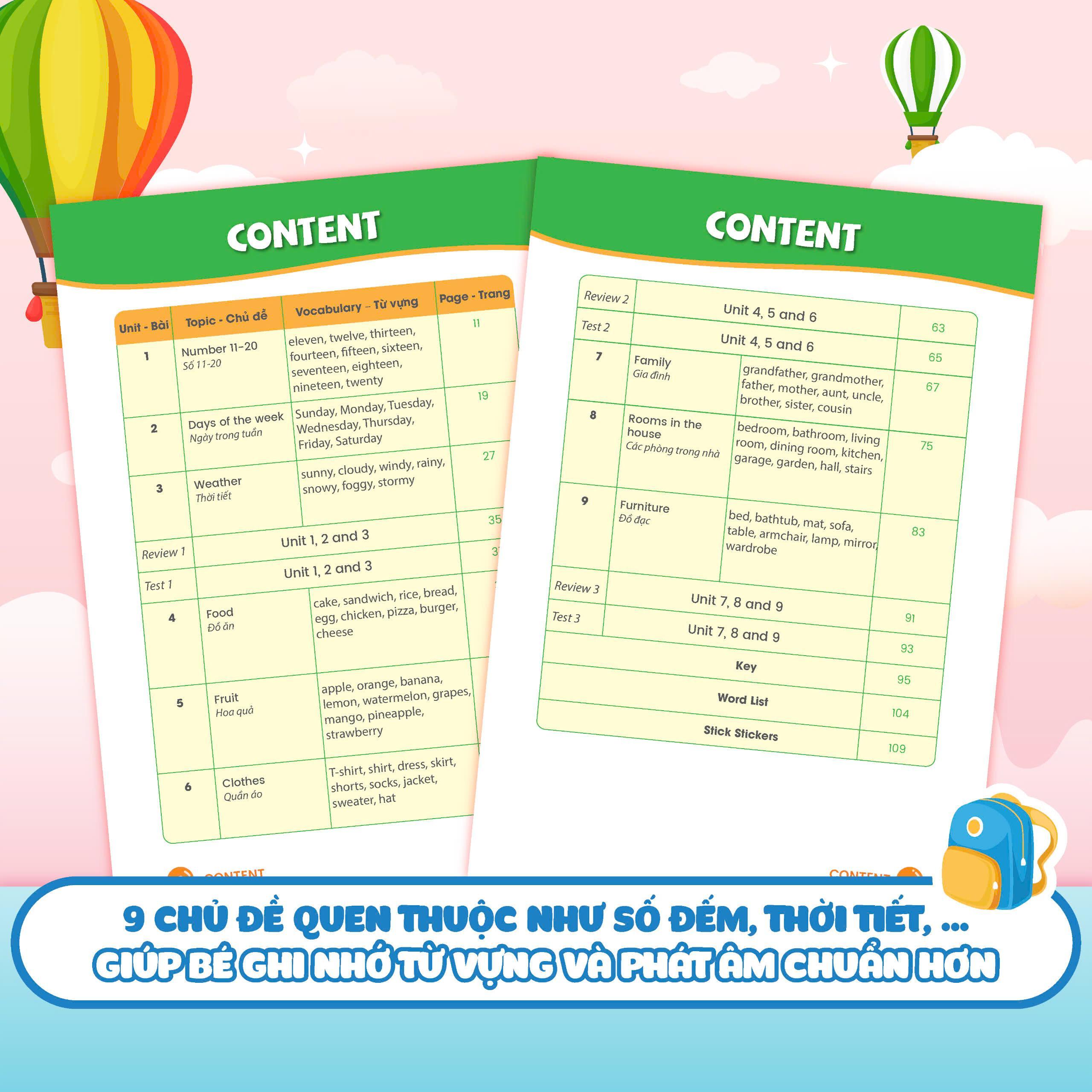 - Con phát âm chuẩn – Ghi nhớ từ vựng của 9 chủ đề quen thuộc: Số đếm, Các ngày trong tuần, Thời tiết, Đồ ăn, Hoa quả…
