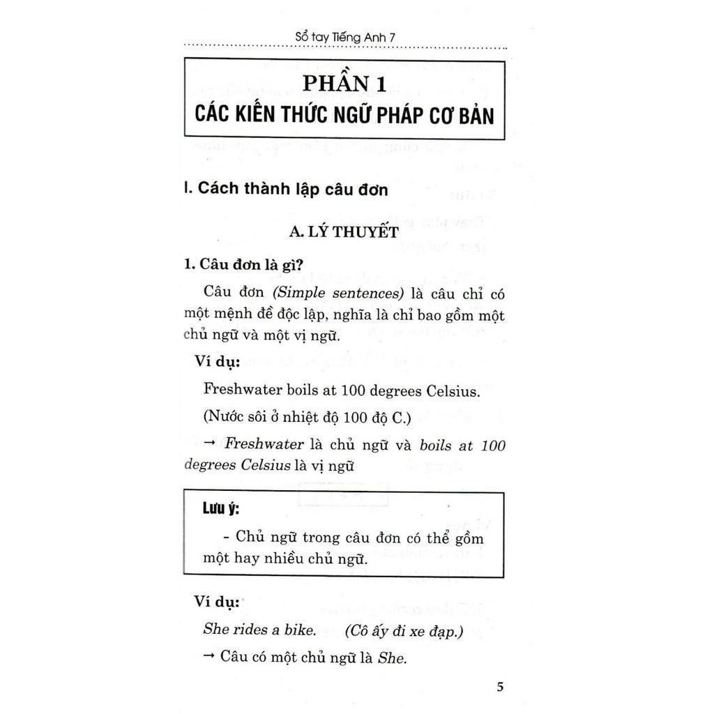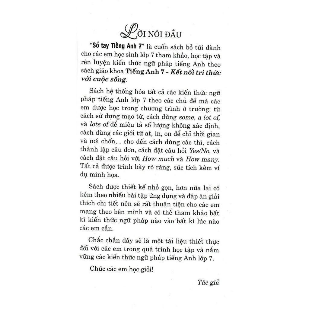 “Sổ tay Tiếng Anh 7” là cuốn sách bỏ túi dành cho các em học sinh lớp 7 tham khảo, học tập và rèn luyện kiến thức ngữ pháp tiếng Anh theo sách giáo khoa Tiếng Anh 7 - Kết nối tri thức với cuộc sống.