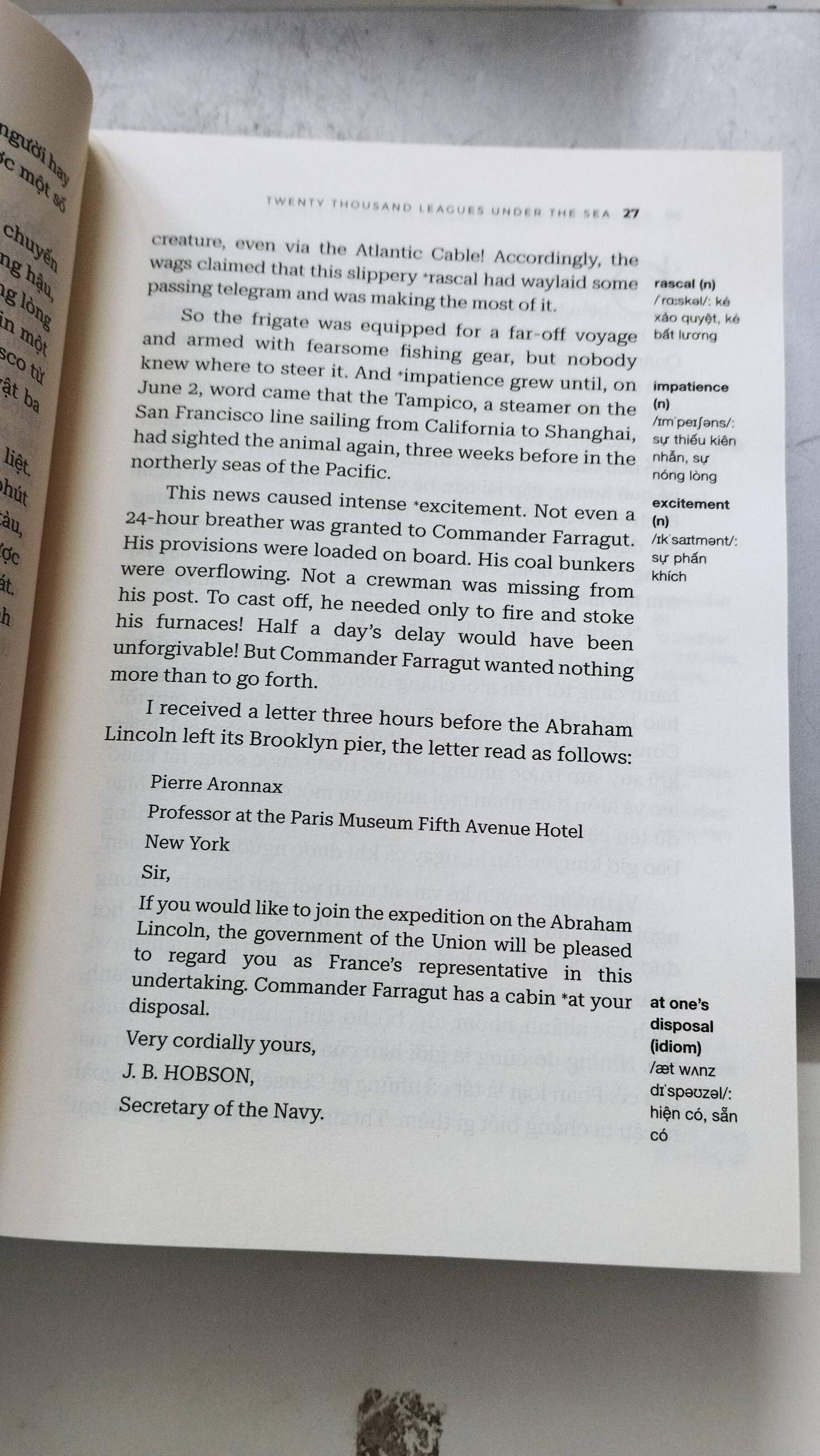 Nhân vật chính, Pierre Aronnax, một nhà khoa học Pháp, cùng người đồng hành là Conseil và thợ săn cá voi Ned Land, đã bị cuốn vào một cuộc hành trình bất ngờ trên Nautilus. Qua các chương hành trình, họ khám phá ra vẻ đẹp kỳ vĩ của đại dương cũng như những bí mật sâu thẳm nằm dưới lớp nước. “Hai vạn dặm dưới biển” không chỉ là một câu chuyện phiêu lưu mạo hiểm mà còn là một tác phẩm giàu trí tưởng tượng, khám phá khoa học và triết lý sâu sắc về tự do và nhân quyền. Sách song ngữ hai vạn dặm dưới biển mang đến một góc nhìn mới mẻ và thú vị cho độc giả.