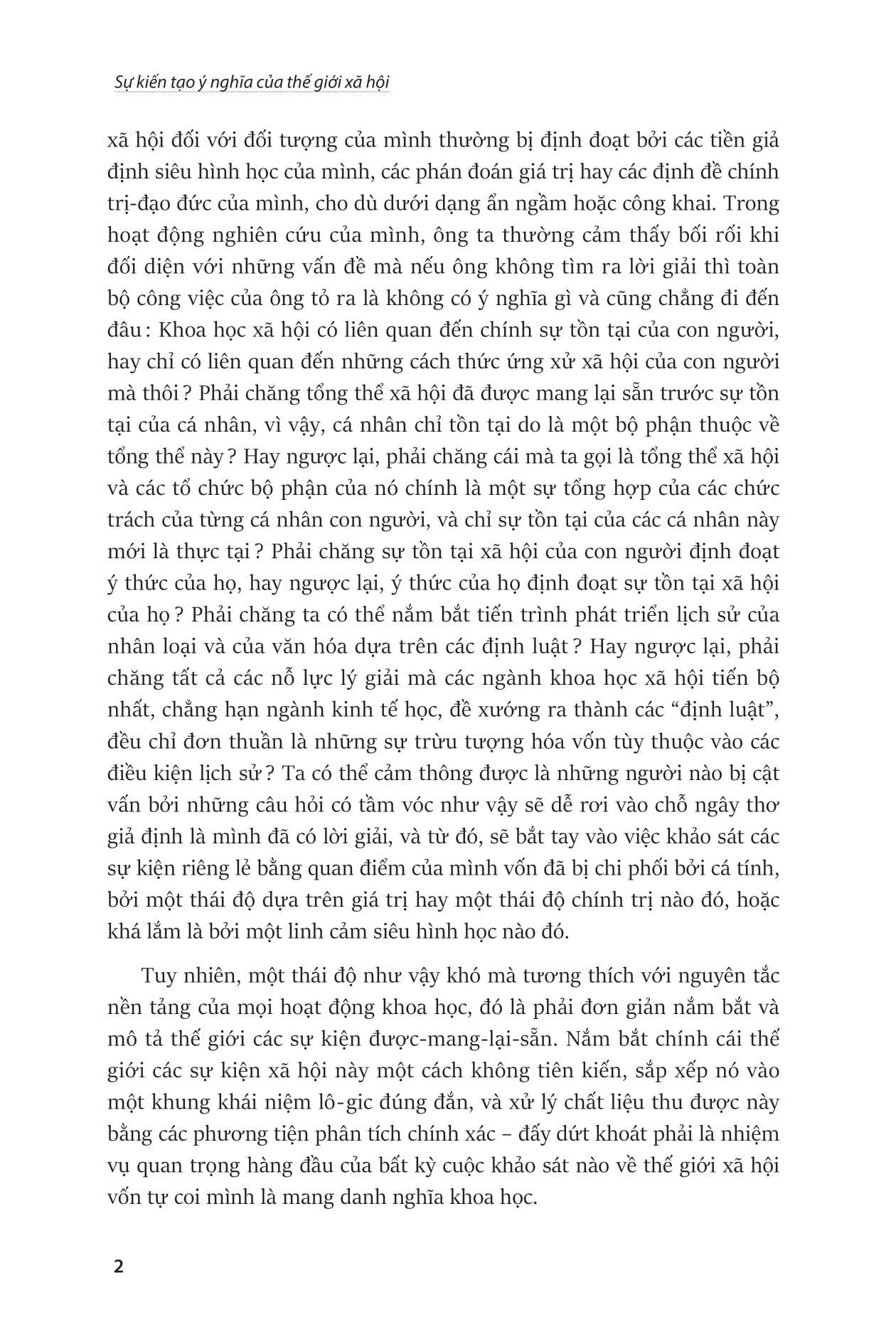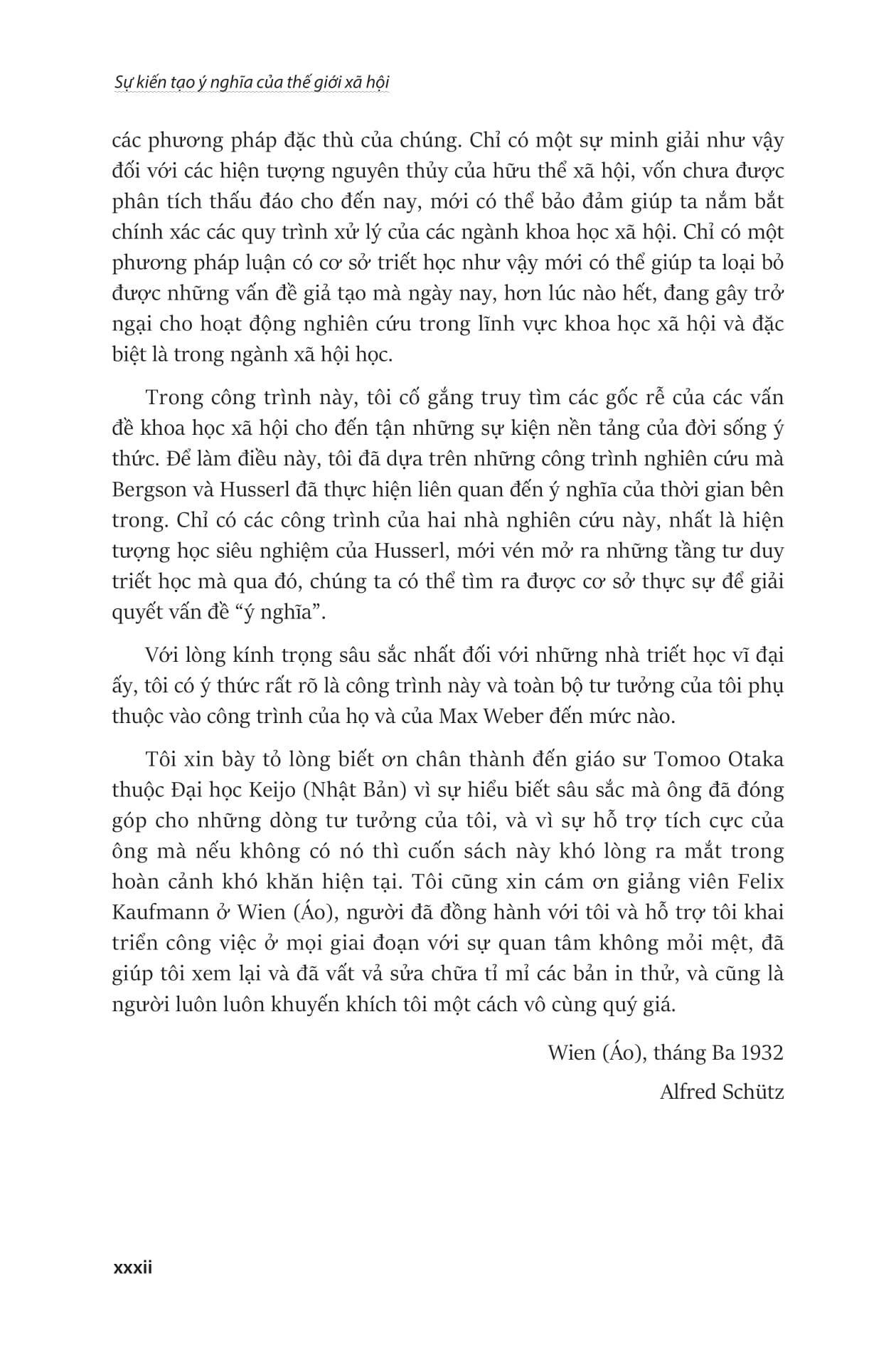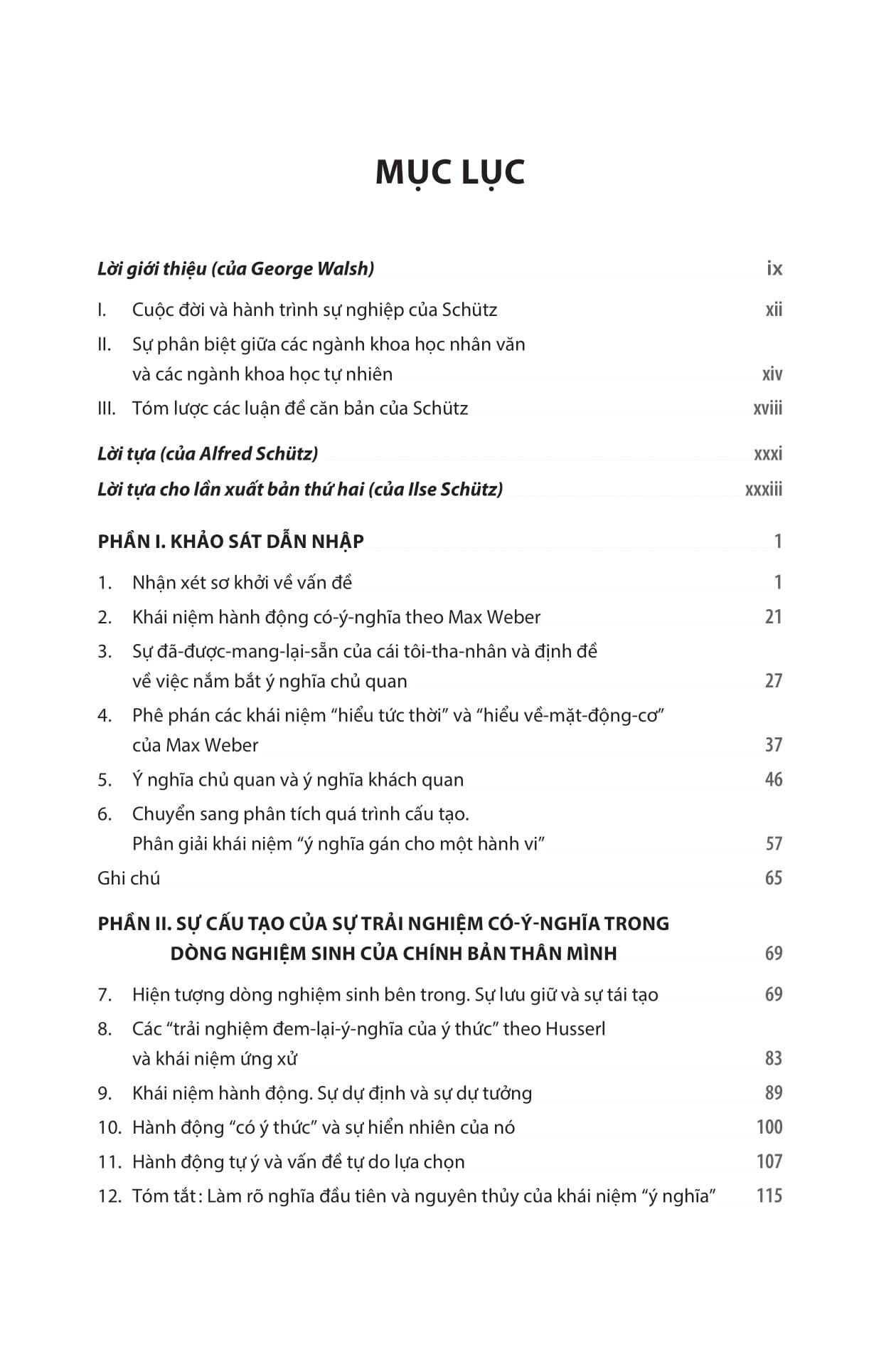 Sự Kiến Tạo Ý Nghĩa Của Thế Giới Xã Hội - Der Sinnhafte Aufbau Der Sozialen Welt Một dẫn nhập vào xã hội học lý giải “Vấn đề mấu chốt của tất cả các ngành khoa học về thế giới xã hội là cấu tạo một bối cảnh ý nghĩa khách quan xuất phát từ những bối cảnh ý nghĩa chủ quan nói chung hoặc từ những bối cảnh ý nghĩa chủ quan cá biệt nào đó. Như vậy, ta có thể tóm tắt vấn đề của bất kỳ ngành khoa học xã hội nào vào câu hỏi sau đây : làm thế nào lại có thể có những ngành khoa học về bối cảnh ý nghĩa chủ quan?” Xuất bản năm 1932, "Sự kiến tạo ý nghĩa của thế giới xã hội" của Alfred Schütz là công trình có tầm ảnh hưởng sâu rộng và lâu dài tới các ngành khoa học xã hội nói chung. Tác phẩm bàn luận chi tiết về hai chủ đề lớn: