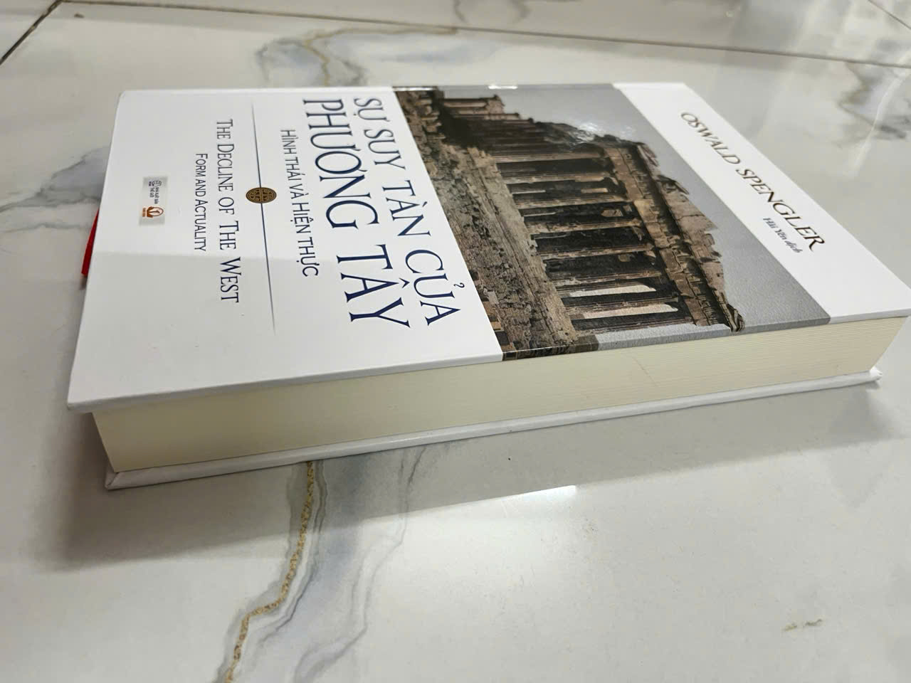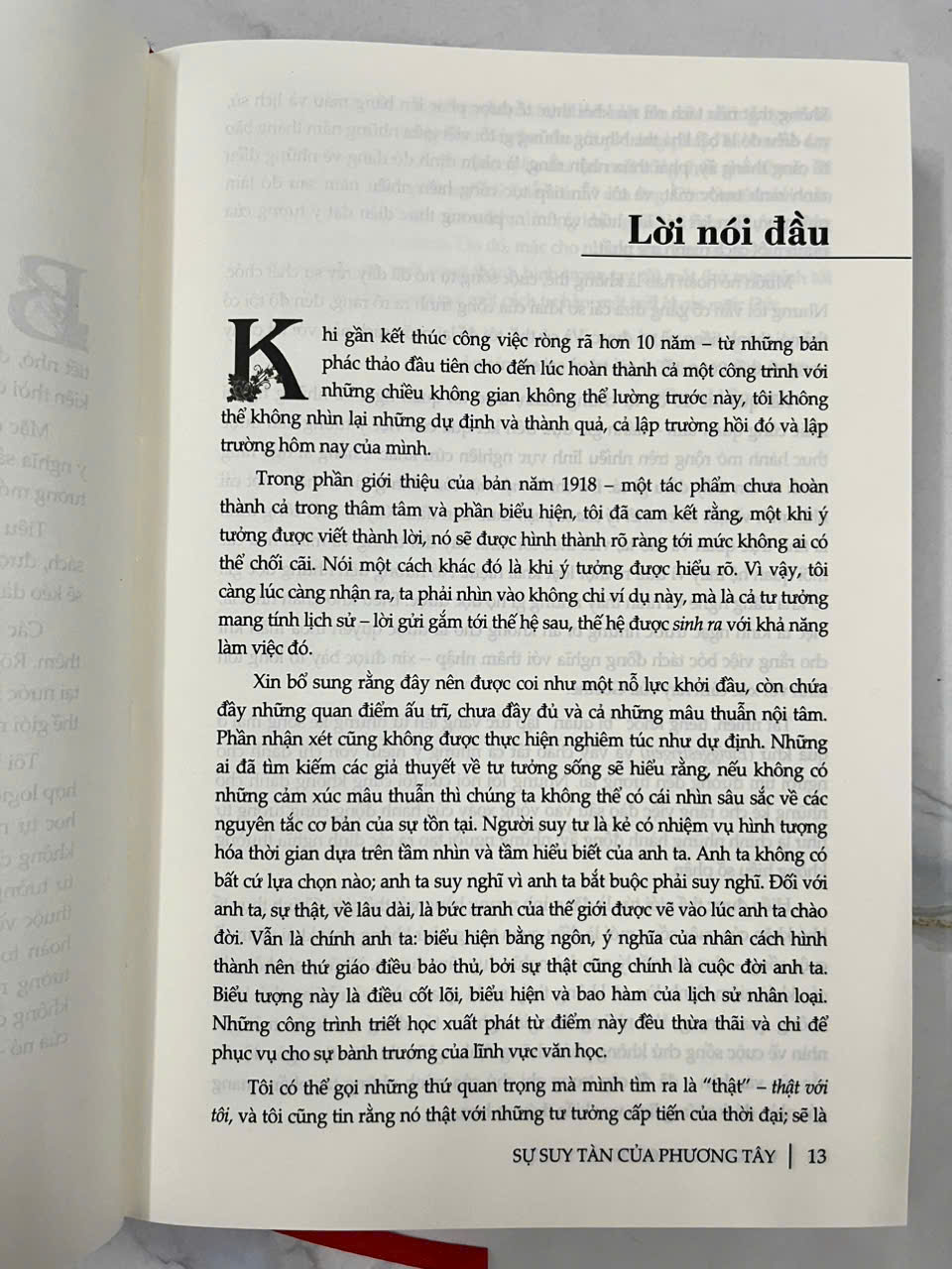 Sách -Sự suy tàn của phương Tây, Hình thái và Hiện thực ( Bìa cứng , bản xin giấy đẹp)   Sự suy tàn của phương Tây  "Sự suy tàn của Phương Tây" (The Decline of the West) là tên một tác phẩm triết học nổi tiếng của Oswald Spengler, xuất bản lần đầu vào năm 1918, trong đó ông đưa ra một cái nhìn về sự suy tàn tất yếu của các nền văn minh, đặc biệt là nền văn minh Phương Tây, từ giai đoạn phát triển sang giai đoạn suy thoái và diệt vong, tương tự như các chu kỳ lịch sử của các nền văn minh khác trong quá khứ   "Oswald Spengler (1880-1936) sinh tại Blankenburg của Đức quốc. Ông học Toán, Triết học và Lịch sử tại Halle, Munich và Berlin. Ông được trao bằng tiến sĩ vào năm 1904 với luận án về Heraclitus. Bộ sách quan trọng nhất của Spengler là Sự suy tàn của phương Tây (Der Untergang des Abendlandes), tập I (Hình thái và Hiện thực) xuất bản vào năm 1918; tập II (Những viễn tượng về lịch sử thế giới) xuất bản vào năm 1922. Sự suy tàn của phương Tây dựa một phần vào triết học của Friedrich Nietzsche, đặc biệt là cuốn Zarathustra đã nói như thế, theo đó Spengler đã xây dựng một cách xuất sắc và kịch tính... ý chí sáng tạo-hướng-đến-sự-sống (the creative will-to-life). Đối với Spengler, Goethe và Nietzsche là hai vĩ nhân đã tạo thành hai cột trụ lớn của đời sống trí thức nước Đức lúc bấy giờ, họ đại diện cho sự thần thánh hóa và suy tàn của văn hóa phương Tây. Khái niệm của Nietzsche về “sự đảo hoán mọi giá trị” là sự khẳng định các giá trị mới của đời sống và niềm lạc thú vượt trên sự khổ hạnh và trinh bạch của đời sống Kitô giáo, nó là hiện thân của một động lực triết học của sự "Trở thành” (Becoming), rất giống với ý tưởng của Goethe về “bản chất sống” (living nature). Ý chí quyền lực (The Will to power) của Nietzsche như một động lực chính trong bản chất con người đã tạo cảm hứng cho Spengler suy tưởng về sự sinh thành và hủy diệt của lịch sử. Sự suy tàn của phương Tây cho đến nay không hề mất đi giá trị của nó, mà ngược lại, ngày càng trở nên quan trọng trong cách diễn giải về các diễn trình lịch sử nhân loại. Ta có thể gọi nó là một triết học về lịch sử, cũng có thể gọi nó là một thiên lịch sử có tính chất triết học, mà trong đó, nhiều dự đoán của Spengler về số phận và tương lai của nhân loại ngày càng ứng nghiệm đến lạ thường."