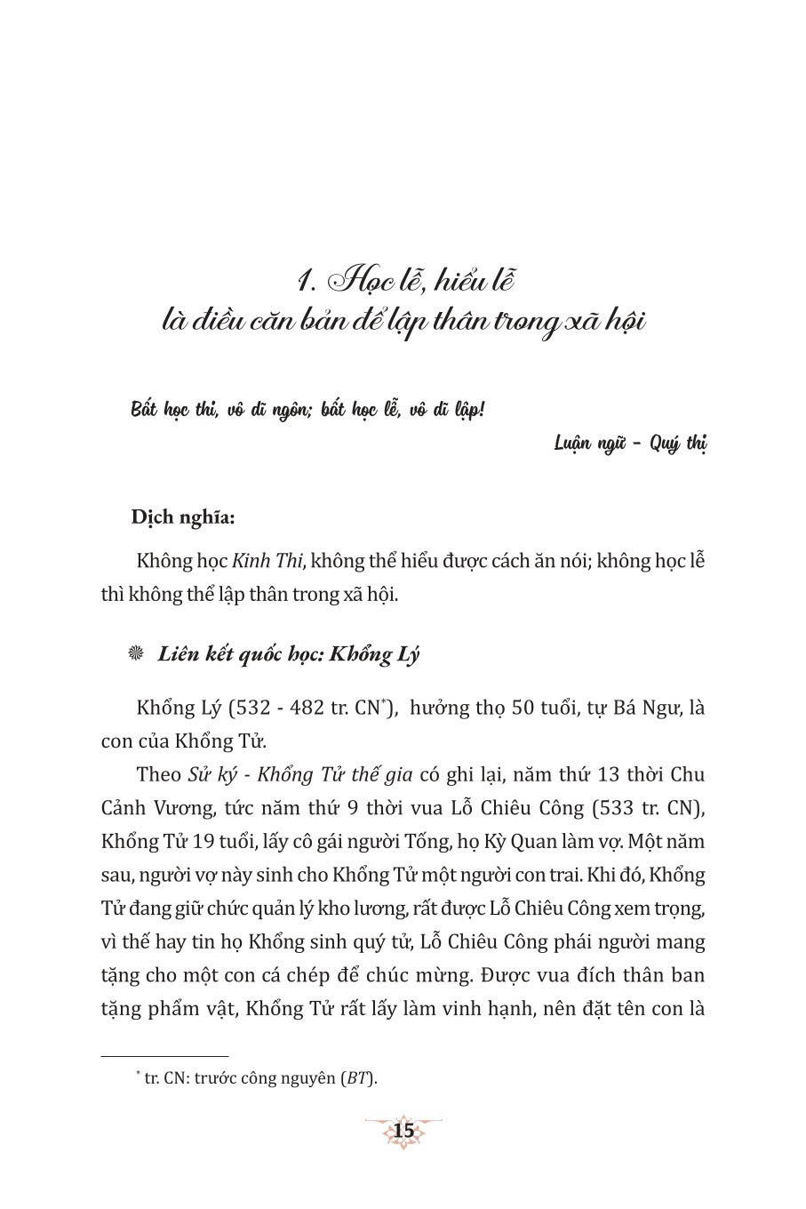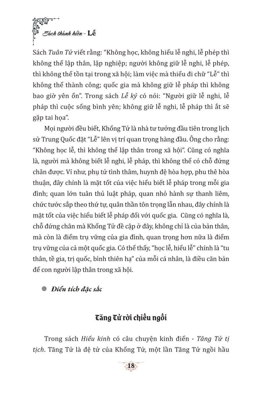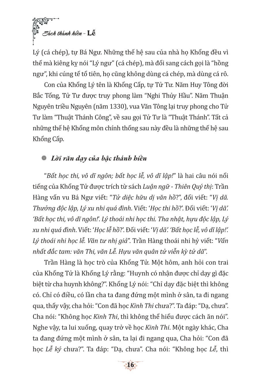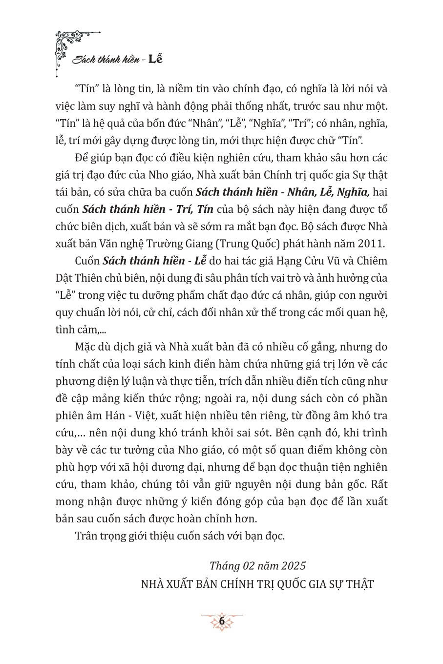 Để giúp bạn đọc có điều kiện nghiên cứu, tham khảo sâu hơn các giá trị đạo đức của Nho giáo, Nhà xuất bản Chính trị quốc gia Sự thật tái bản, có sửa chữa ba cuốn Sách thánh hiền - Nhân, Lễ, Nghĩa, hai cuốn Sách thánh hiền - Trí, Tín của bộ sách này hiện đang được tổ chức biên dịch, xuất bản và sẽ sớm ra mắt bạn đọc. Bộ sách được Nhà xuất bản Văn nghệ Trường Giang (Trung Quốc) phát hành năm 2011. Cuốn Sách thánh hiền - Lễ do hai tác giả Hạng Cửu Vũ và Chiêm Dật Thiên chủ biên, nội dung đi sâu phân tích vai trò và ảnh hưởng của "Lễ trong việc tu dưỡng phẩm chất đạo đức cá nhân, giúp con người quy chuẩn lời nói, cử chỉ, cách đối nhân xử thế trong các mối quan hệ, tình cảm,... Mặc dù dịch giả và Nhà xuất bản đã có nhiều cố gắng, nhưng do tính chất của loại sách kinh điển hàm chứa những giá trị lớn về các phương diện lý luận và thực tiễn, trích dẫn nhiều điển tích cũng như đề cập mảng kiến thức rộng; ngoài ra, nội dung sách còn có phần phiên âm Hán - Việt, xuất hiện nhiều tên riêng, từ đồng âm khó tra cứu,... nên nội dung khó tránh khỏi sai sót. Bên cạnh đó, khi trình bày về các tư tưởng của Nho giáo, có một số quan điểm không còn phù hợp với xã hội đương đại, nhưng để bạn đọc thuận tiện nghiên cứu, tham khảo, chúng tôi vẫn giữ nguyên nội dung bản gốc. Rất mong nhận được những ý kiến đóng góp của bạn đọc để lần xuất bản sau cuốn sách được hoàn chỉnh hơn. Trân trọng giới thiệu cuốn sách với bạn đọc.