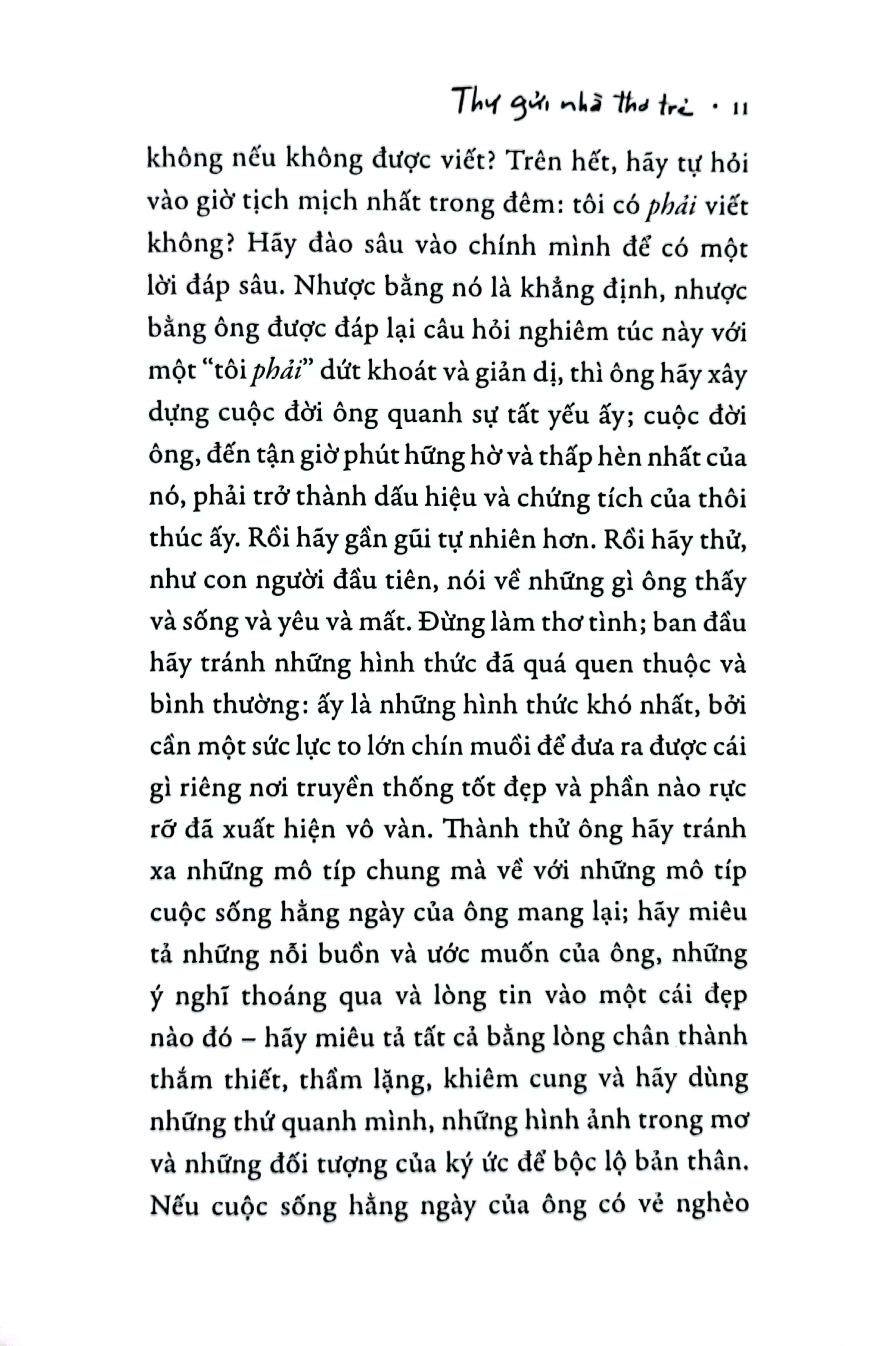 Một trong những nhà thơ lớn nhất của thế kỷ XX Rainer Maria Rilke đã viết cho nhà thơ trẻ Franz Xaver Kappus như thế, để tồi hôm nay những tri kiến quý báu ấy đọng lại trong Thư gửi nhà thơ trẻ. Xuyên suốt tập thư là quan điểm của Rainer Maria Rilke về đời sống cũng như chất liệu nó mang lại cho thi ca: tình yêu, tình dục, nỗi cô đơn, nỗi buồn, nỗi hoài nghi v.v… Và, nếu kẻ cầm bút nào thấy đời sống m.ình quá tẻ nhạt thì “hãy tự trách m.ình, tự nhủ m.ình không đủ chất thi sĩ để gọi lên những phong nhiêu của nó; bởi đối với kẻ sáng tạo thì chăng có cái gì là nghèo nàn và chẳng có chốn nào là tẻ nhạt, xoàng xĩnh”.