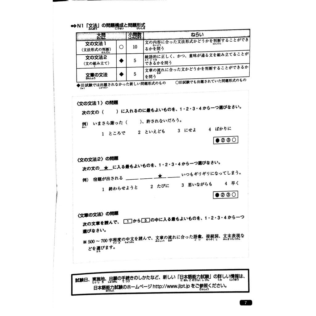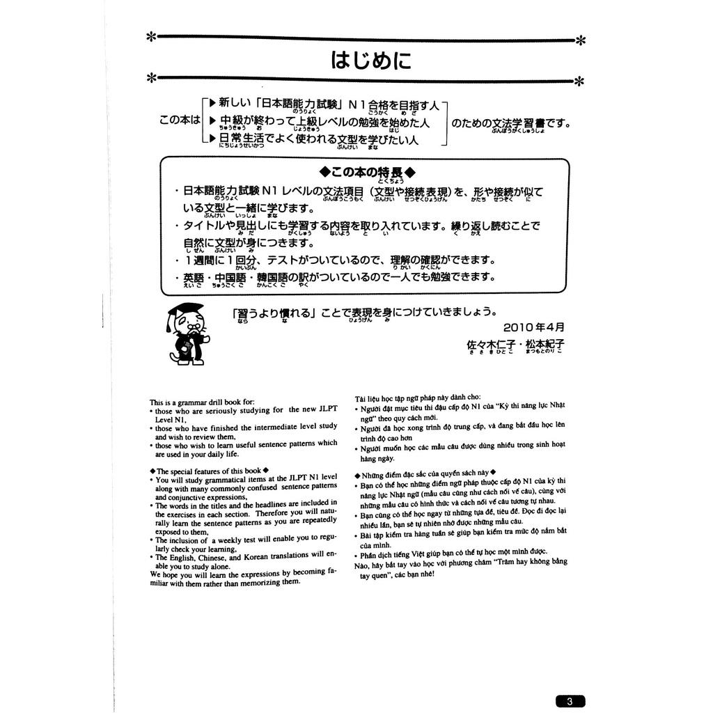 GIỚI THIỆU SÁCH Luyện Thi Năng Lực Nhật Ngữ N1 - Ngữ Pháp Luyện thi Năng lực Nhật ngữ N1 gồm 5 quyển: Hán tự (Kanji), Từ vựng (Goi), Đọc hiểu (Dokkai), Nghe hiểu (Choukai) và Ngữ pháp (Bunpou). Đây là một tựa sách học tiếng Nhật hàng đầu trong hệ thống phân phối sách Kinokuniya lớn nhất Nhật Bản. Bộ sách này giúp những bạn chuẩn bị tham gia Kỳ thi năng lực Nhật ngữ JLPT nắm được những nội dung kiến thức cần phải có trong năng lực Nhật ngữ - trình độ N1 một cách nhanh chóng, hiệu quả và tổng quát nhất trong khoảng thời gian từ 4 đến 6 tuần.