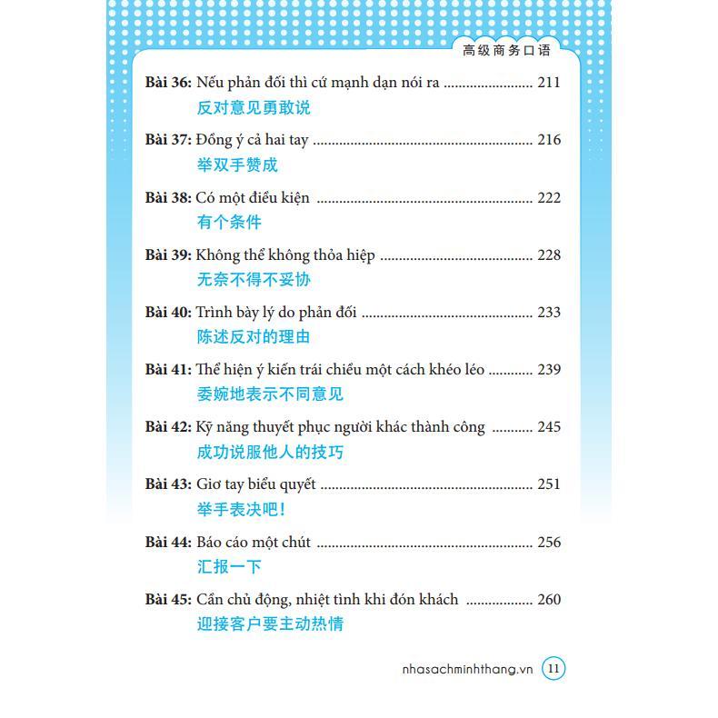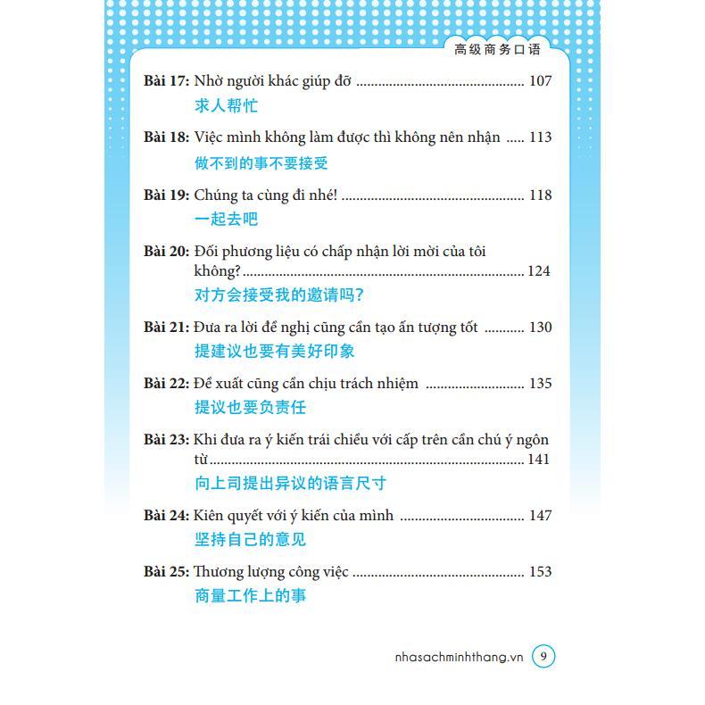 Cuốn sách gồm 60 bài, với những mẫu câu giao tiếp kèm theo thuật ngữ thương mại, giải thích ngữ pháp ngắn gọn được trình bày trong các chủ đề thực tế, những tình huống thường xảy ra trong nội bộ công ty cũng như khi gặp gỡ thương lượng với đối tác như: cách xưng hô, cách trình bày ý kiến cá nhân sao cho khéo léo, vấn đề giá cả, phương thức thanh toán, chiết khấu, ký kết hợp đồng…