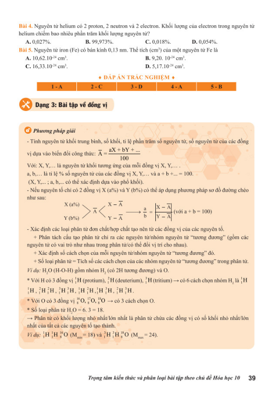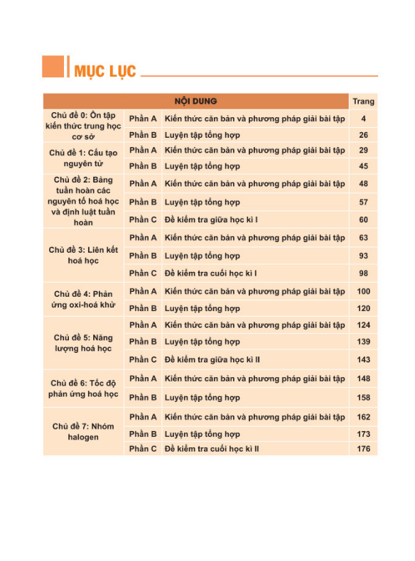 Phần 1: Tóm tắt có mở rộng và nâng cao kiến thức quan trọng của bài học theo từng chủ đề của SGK, có phân dạng và giải chi tiết bài tập tự luận và có bài tập trắc nghiệm đối với từng dạng để học sinh luyện tập. Đặc biệt với cuốn lớp 10 các tác giả đưa vào chủ đề 0: "Ôn tập kiến thức trung học cơ sở" nhằm giúp các em học sinh ôn tập lý thuyết trọng tâm, công thức tính và các dạng bài toán Hóa học cơ bản ở THCS để từ đó các em có sự tự tin khi học các chuyên đề của SGK Hóa học 10 mới