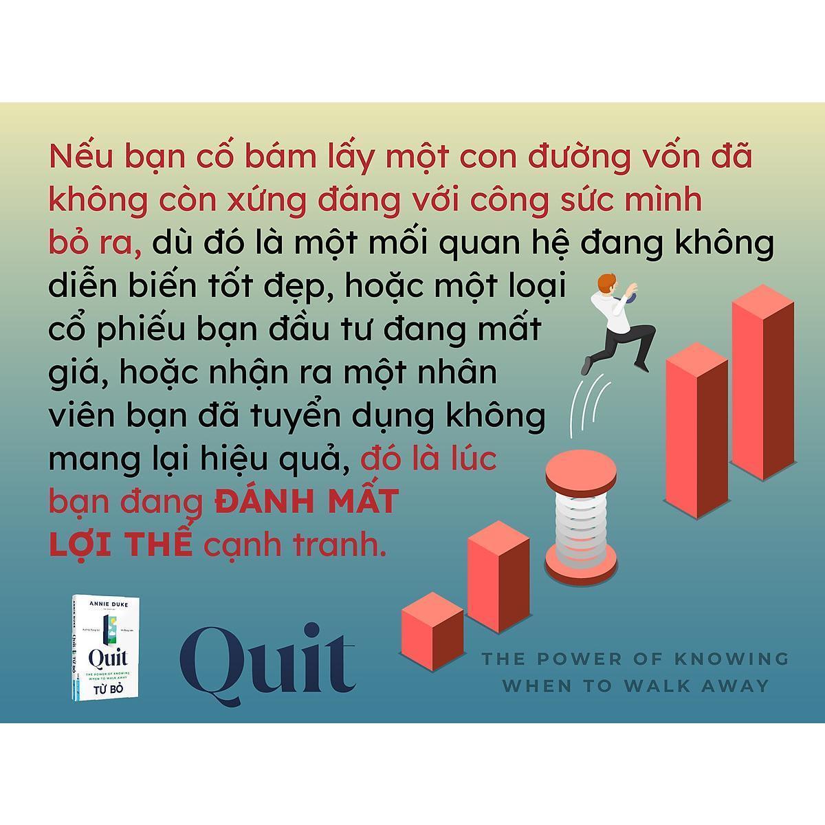 Tuy nhiên, Annie Duke – tác giả, diễn giả, nhà tư vấn trong lĩnh vực ra quyết định và là Tiến sĩ về Tâm lý học Nhận thức – đã lật ngược những niềm tin phổ biến này thông qua cuốn sách “Từ bỏ” (tựa gốc: Quit). Cô cho rằng thành công không nằm ở việc bám chặt lấy mục tiêu mà nằm ở việc xác định mục tiêu đáng theo đuổi và biết từ bỏ những thứ không còn phục vụ cho hạnh phúc lâu dài của mình.