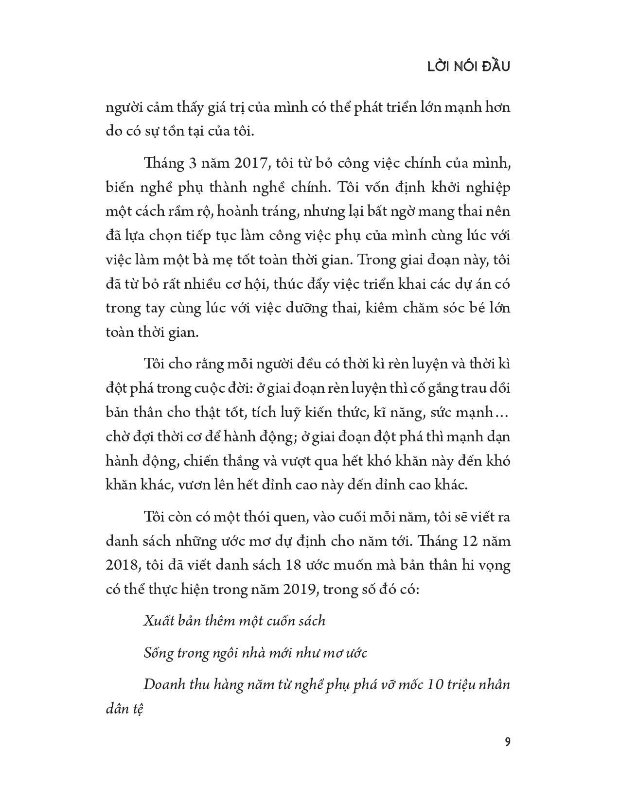 Theo ý nghĩa truyền thống, nghề phụ chỉ một công việc khác được làm vào lúc rảnh rỗi tận dụng được trong khi có một công việc toàn thời gian, là hành vi ngắn hạn. Nhưng ngày nay, nghề phục đích thực phải là đam mê và sở trường, là cách thể hiện giá trị tự thân, là hành vi dài hạn. Nghề chính, nghề phụ có thể cân bằng và bổ trợ cho nhau một cách hoàn hảo. Trong thời đại số, ý nghĩa của việc bắt đầu một nghề phụ không chỉ là tăng thêm một nguồn thu nhập, mà còn có khả năng cạnh tranh cốt lõi, là một kênh vô cùng quan trọng để chúng ta theo đuổi chính mình, thiết kế cuộc sống và thực hiện ước mơ của mình.