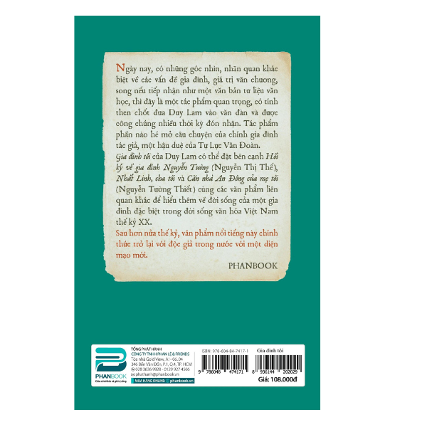 Thông tin chi tiết Mã hàng 8936144202029 Tên Nhà Cung Cấp Phanbook Tác giả Duy Lam NXB Đà Nẵng Năm XB 2023 Ngôn Ngữ Tiếng Việt Trọng lượng (gr) 160 Kích Thước Bao Bì 20 x 13 x 0.7 cm Số trang 144 Hình thức Bìa Mềm Mô tả sản phẩm Gia Đình Tôi Ngày nay, có những góc nhìn, nhãn quan khác biệt về các vấn đề gia đình, giá trị văn chương, song nếu tiếp nhận như một văn bản văn học, thì đây là một tác phẩm quan trọng, có tính then chốt đưa Duy Lam vào văn đàn và được công chúng nhiều thời kỳ đón nhận. Tác phẩm phần nào hé mở câu chuyện của chính gia đình tác giả, một hậu duệ của Tự Lực Văn Đoàn. Gia đình tôi của Duy Lam có thể đặt cạnh Hồi ký về gia đình Nguyễn Tường (Nguyễn Thị Thế), Nhất Linh, cha tôi và Căn nhà An Đông của mẹ tôi (Nguyễn Tường Thiết) cùng các tác phẩm liên quan khác để hiểu thêm về đời sống của một gia đình đặc biệt trong đời sống văn hóa Việt Nam thế kỷ XX. Sau hơn nửa thế kỷ, văn phẩm nổi tiếng này chính thức trở lại với độc giả trong nước với một diện mạo mới