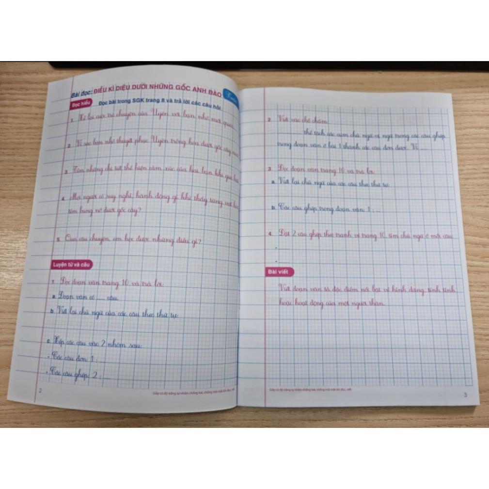tVới 2 bài học, mỗi tuần gồm các câu hỏi và bài tập được trình bày trên giấy ô li bằng kiểu chữ tiểu học hiện hành sẽ giúp các em vừa rèn được kĩ năng trả lời câu hỏi vừa rèn viết chữ được sạch, đẹp, trình bày rõ ràng.