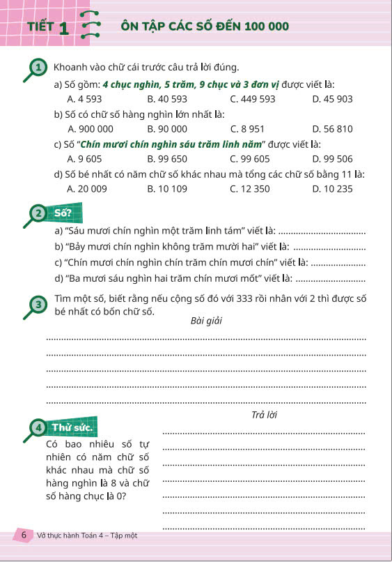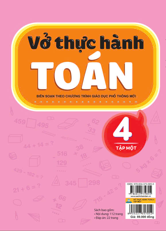 Bộ “Vở thực hành Toán” gồm 10 cuốn (mỗi lớp gồm hai cuốn tập một và tập hai). Bộ sách viết theo từng tiết học, bám sát nội dung sách giáo khoa. Về cơ bản mỗi tiết gồm 3 đến 5 bài tập chọn lọc với hai dạng: Trắc nghiệm và Tự luận. Mỗi tiết sẽ có một trong các bài: Đố vui, Thử sức hoặc Cùng trải nghiệm. Được thử sức thường xuyên với các dạng bài tập như thế sẽ giúp các em phát triển tư duy, tạo hứng thú và rèn kĩ năng vận dụng kiến thức toán học vào thực tế cuộc sống. Cuốn “Vở thực hành Toán 4 – Tập một” có phần đáp án được tích hợp ở mã QR in trên bìa gấp mép,