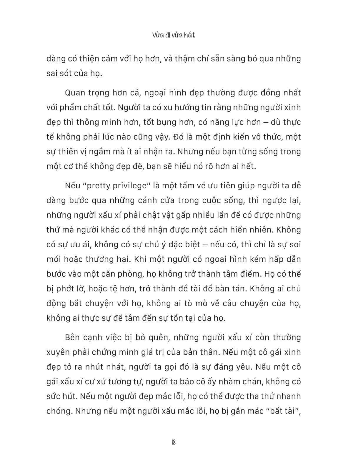 Hãy để cuốn sách nhắc bạn nhớ: Bạn không cần phải gồng lên để đối chọi thế giới ngoài kia một m.ình. Hãy cứ chật vật và là-chính-m.ình. Sẽ luôn có một người đi song song với bạn, không hề thúc giục, hối ép, chỉ “vừa đi vừa hát”.