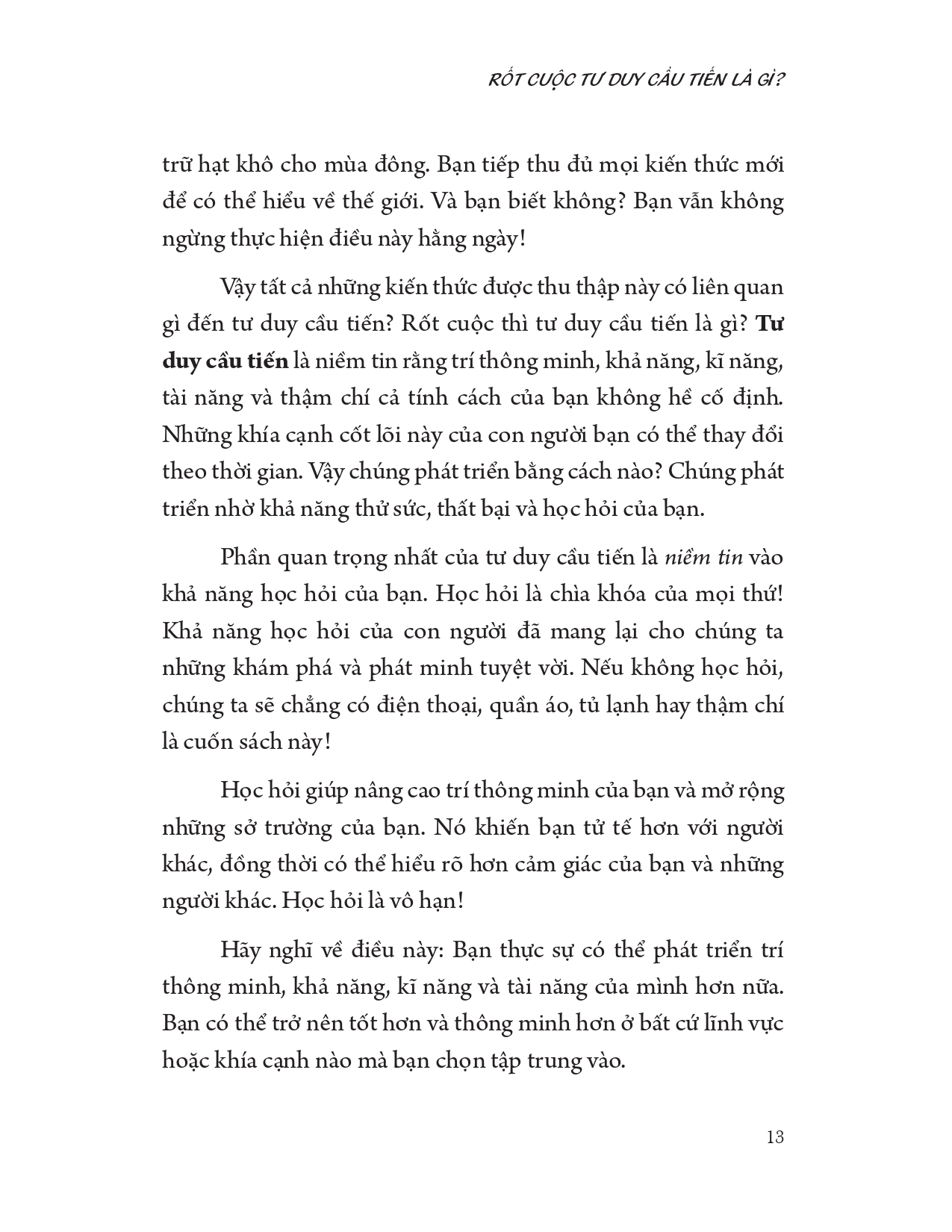 Bạn thực sự có thể phát triển trí thông minh, khả năng, kĩ năng và tài năng của mình hơn nữa. Bạn có thể trở nên tốt hơn và thông minh hơn ở bất cứ lĩnh vực hoặc khía cạnh nào mà bạn chọn tập trung vào.
