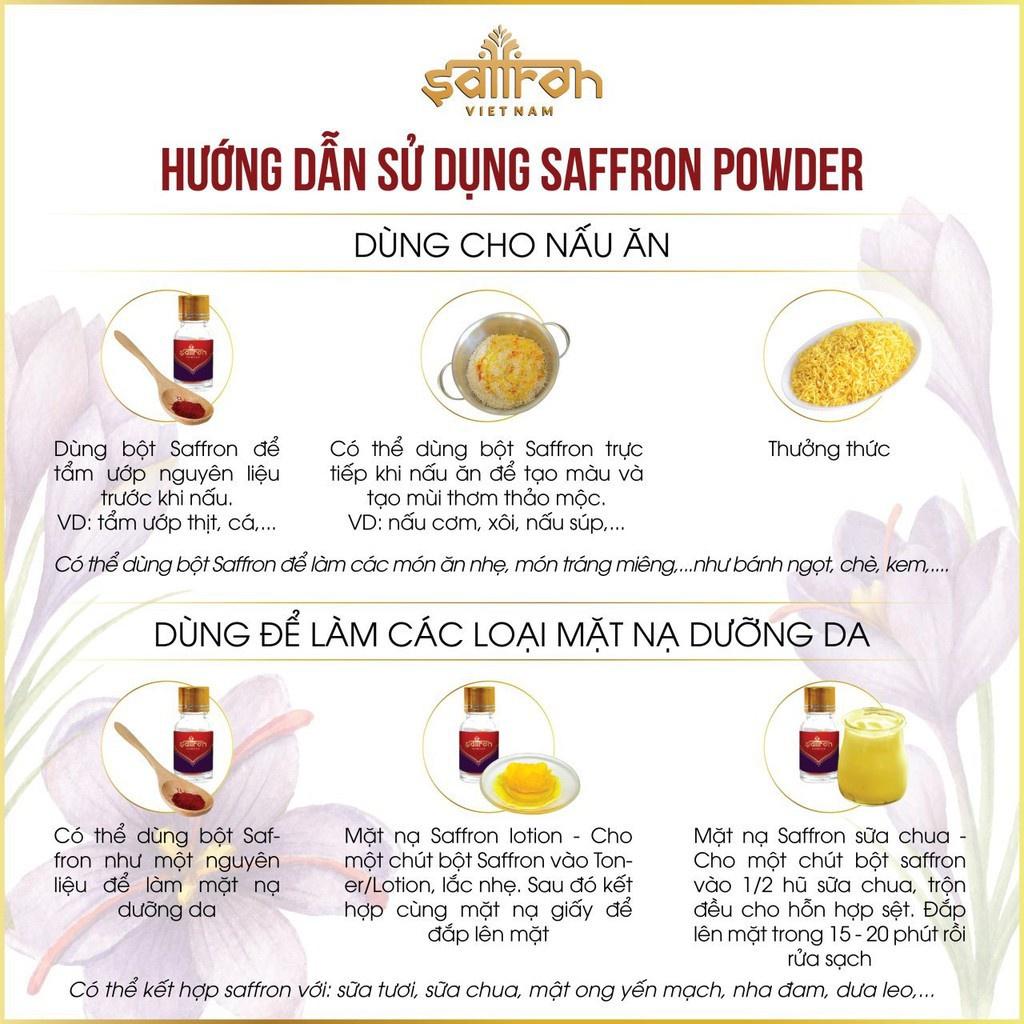 - Do khí hậu Việt Nam độ ẩm cao, dễ bị ẩm vì thế không nên để sản phẩm quá lâu rồi mới sử dụng. Nếu đã mở nắp, chỉ nên dùng trong 3 tháng là tốt nhất. Bột Saffron được nghiền từ 100% sợi Saffron nguyên chất, rất tiện dụng và dễ sử dụng. CÁCH SỬ DỤNG:
