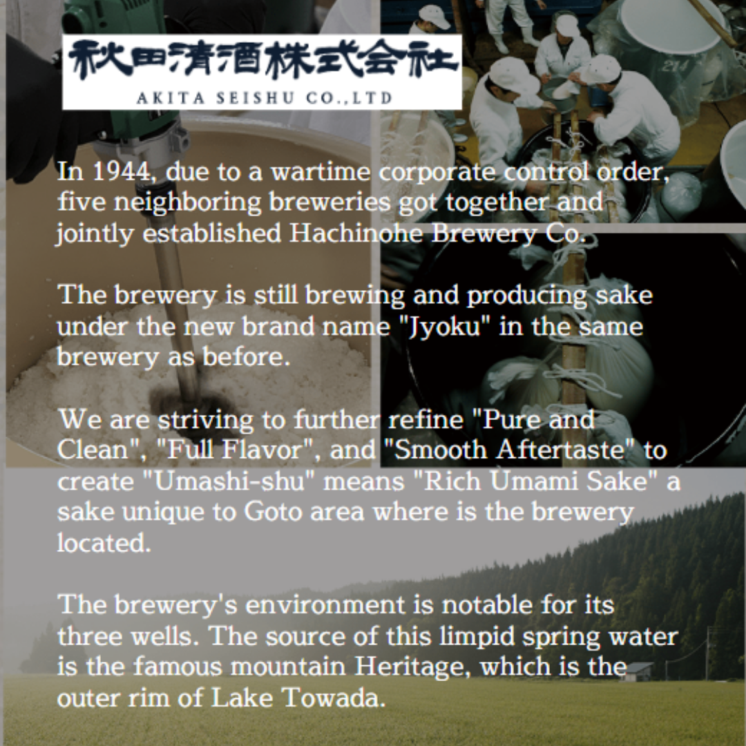 Được làm bằng 100% "Fukunoka" là loại gạo mới phù hợp để ủ rượu sake do tỉnh Fukushima sản xuất, được lên men trong thời gian dài ở nhiệt độ thấp. Bạn có thể thưởng
