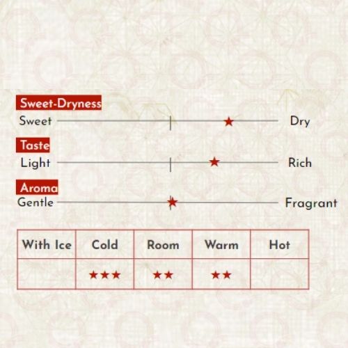 Được ủ trong thùng gỗ tuyết tùng ngay trước khi đóng chai, loại rượu Sake Taru ("thùng") này bùng nổ với hương vị nồng nàn và đặc sắc. Có vị cay và hương thơm thảo
