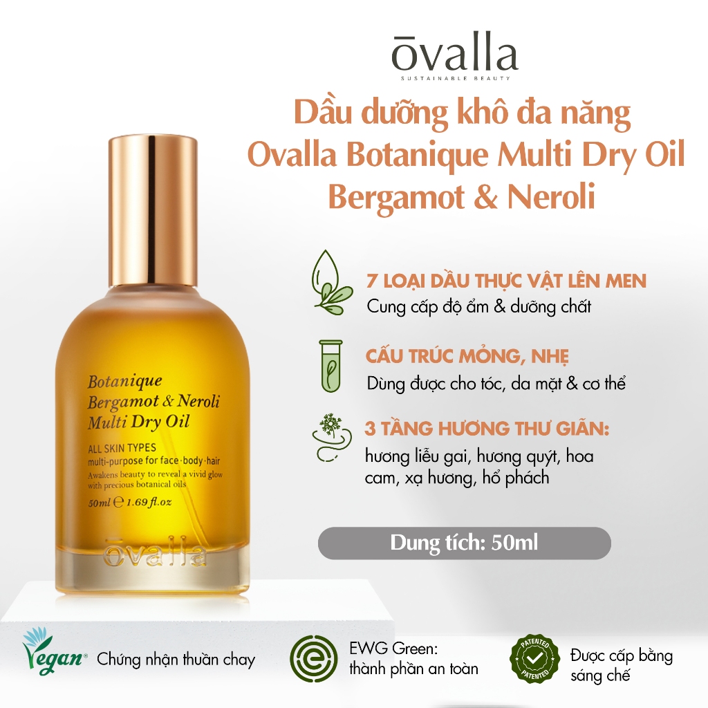 - Dầu dưỡng ẩm đa năng thuần chay Ovalla Multi Dry Oil - sản phẩm với công thức độc quyền của Ovalla gồm thành phần từ 7 loại dầu thực vật lên men giúp cung cấp độ ẩm cho da, ngăn ngừa lão hóa và tăng cường sức sống cho làn da. Thành phần còn có Bisabolol giúp làm trắng và Idebenone có hiệu quả trong việc cải thiện nếp nhăn.