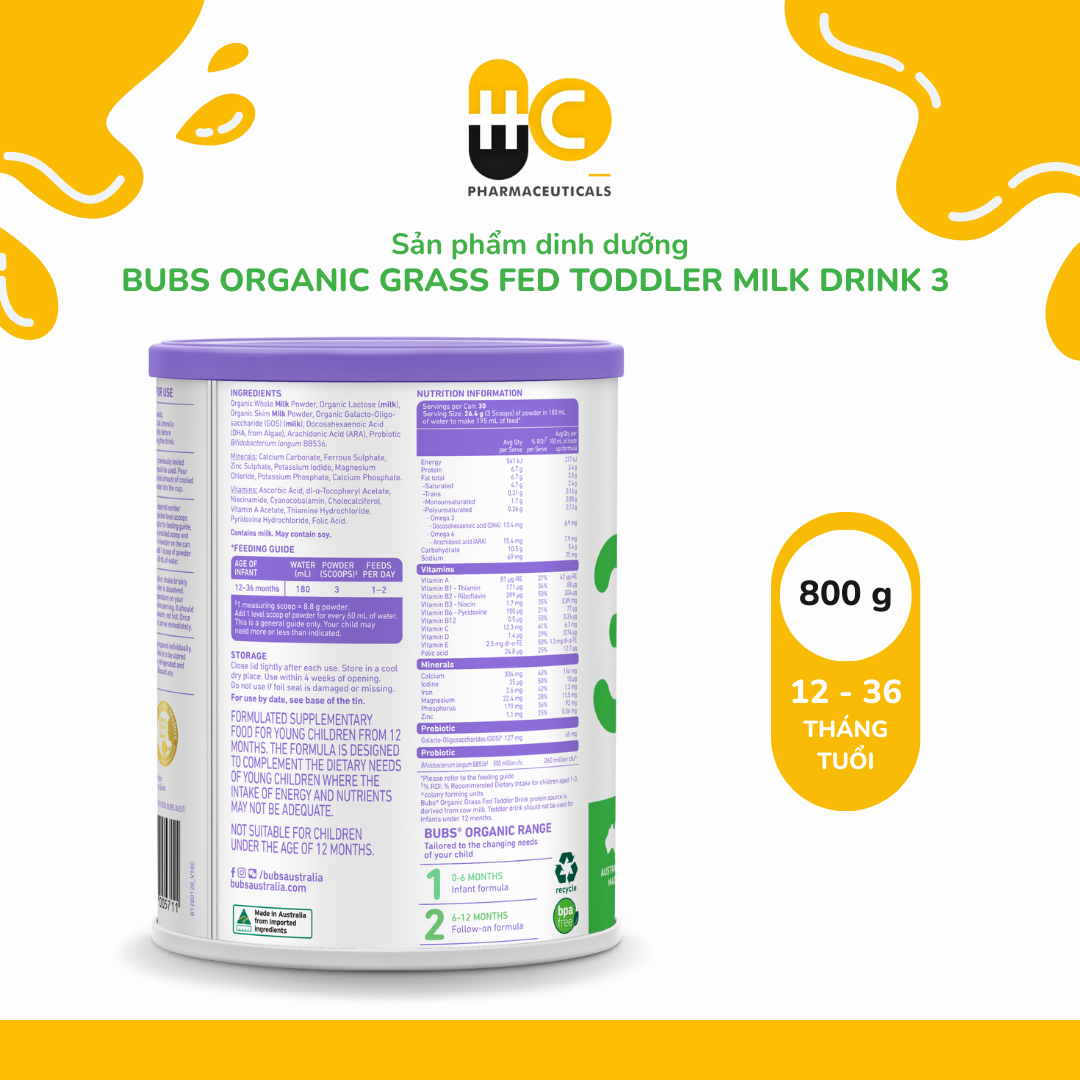 Mua tại TiktokSản phẩm dinh dưỡng công thức hữu cơ Bubs Organic Grass Fed Toddler Milk Drink 3 (12–36 tháng tuổi) – Hộp 800g Đặc điểm nổi bật